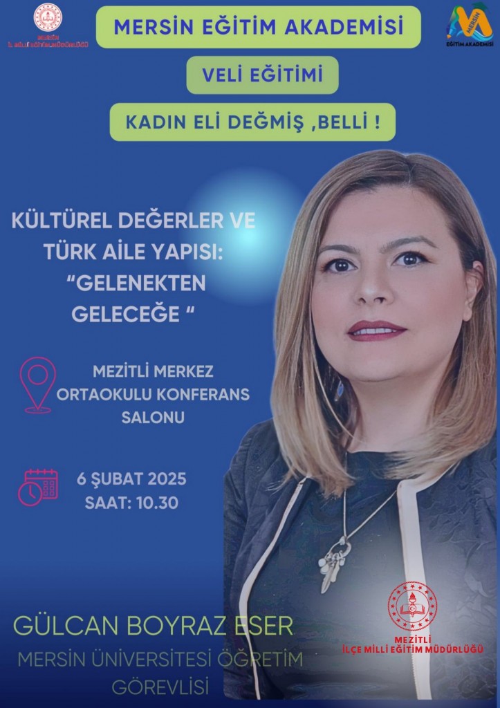 Üniversitemiz Rehberlik ve Psikolojik Danışmanlık Uygulama ve Araştırma Merkezi bünyesinde görev yapmakta olan Öğr. Gör. Gülcan Boyraz Eser, Mersin İl Milli Eğitim Müdürlüğü tarafından yürütülen "Kadın Eli Değmiş, Belli! " projesi kapsamında 09 N