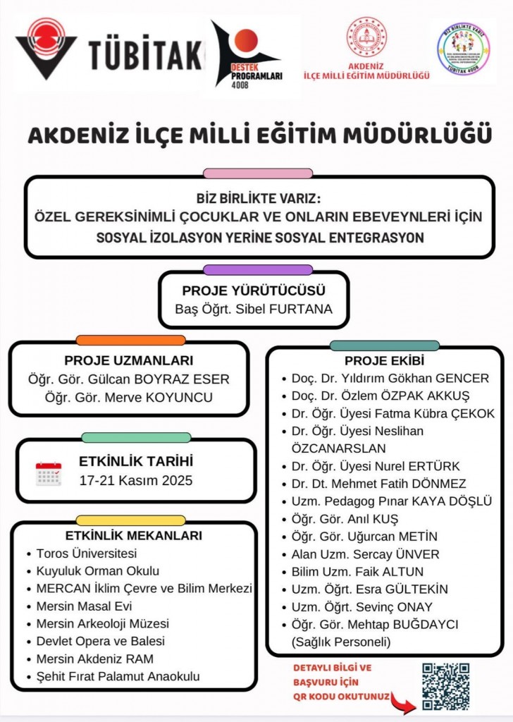 Akdeniz İlçe Milli Eğitim Müdürlüğü tarafından yürütülen TÜBİTAK 4008 “Biz Birlikte Varız: Özel Gereksinimli Çocuklar ve Onların Ebeveynleri İçin Sosyal İzolasyon Yerine Sosyal Entegrasyon” projesi Mersin’de başarı