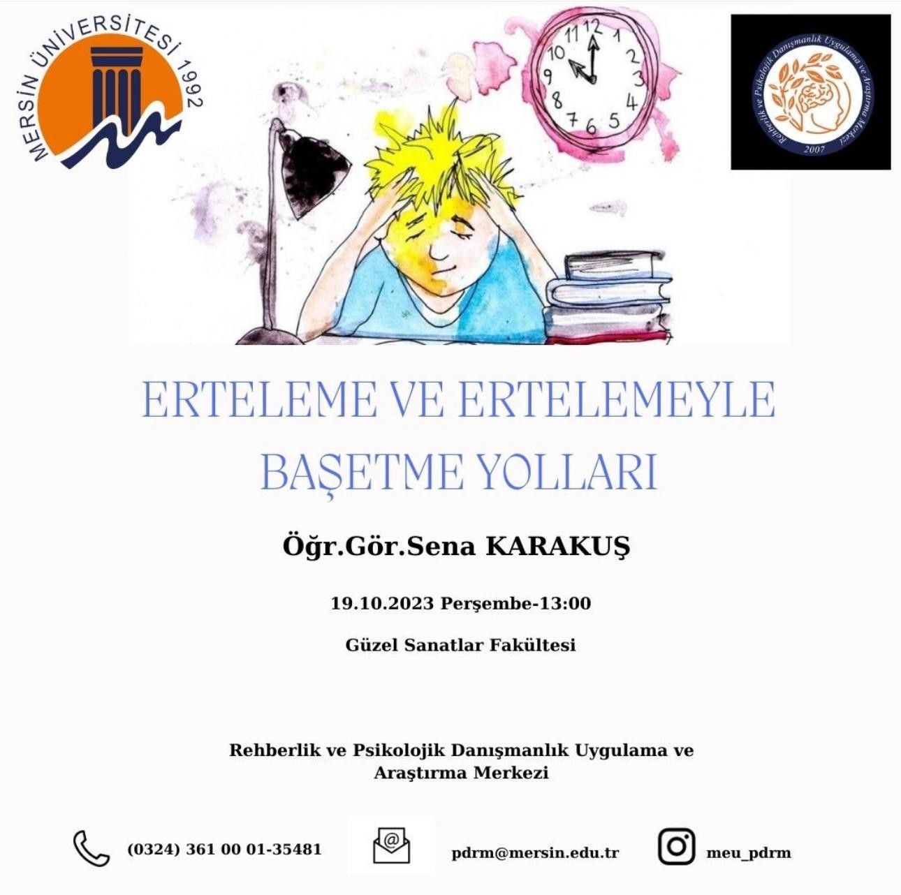 19 Ekim 2023 tarihinde Güzel Sanatlar Fakültesi öğrencilerine yönelik Öğr. Gör. Sena Karakuş tarafından "Erteleme ve Ertelemeyle Baş Etme Yolları" isimli seminer gerçekleştirilmiştir.