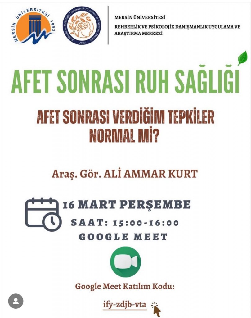 6 Şubat 2023 tarihli Kahramanmaraş merkezli deprem sonrasında üniversitemiz öğrencilerine yönelik Afet Sonrası Ruh Sağlığı seminerleri gerçekleştirilmiştir.