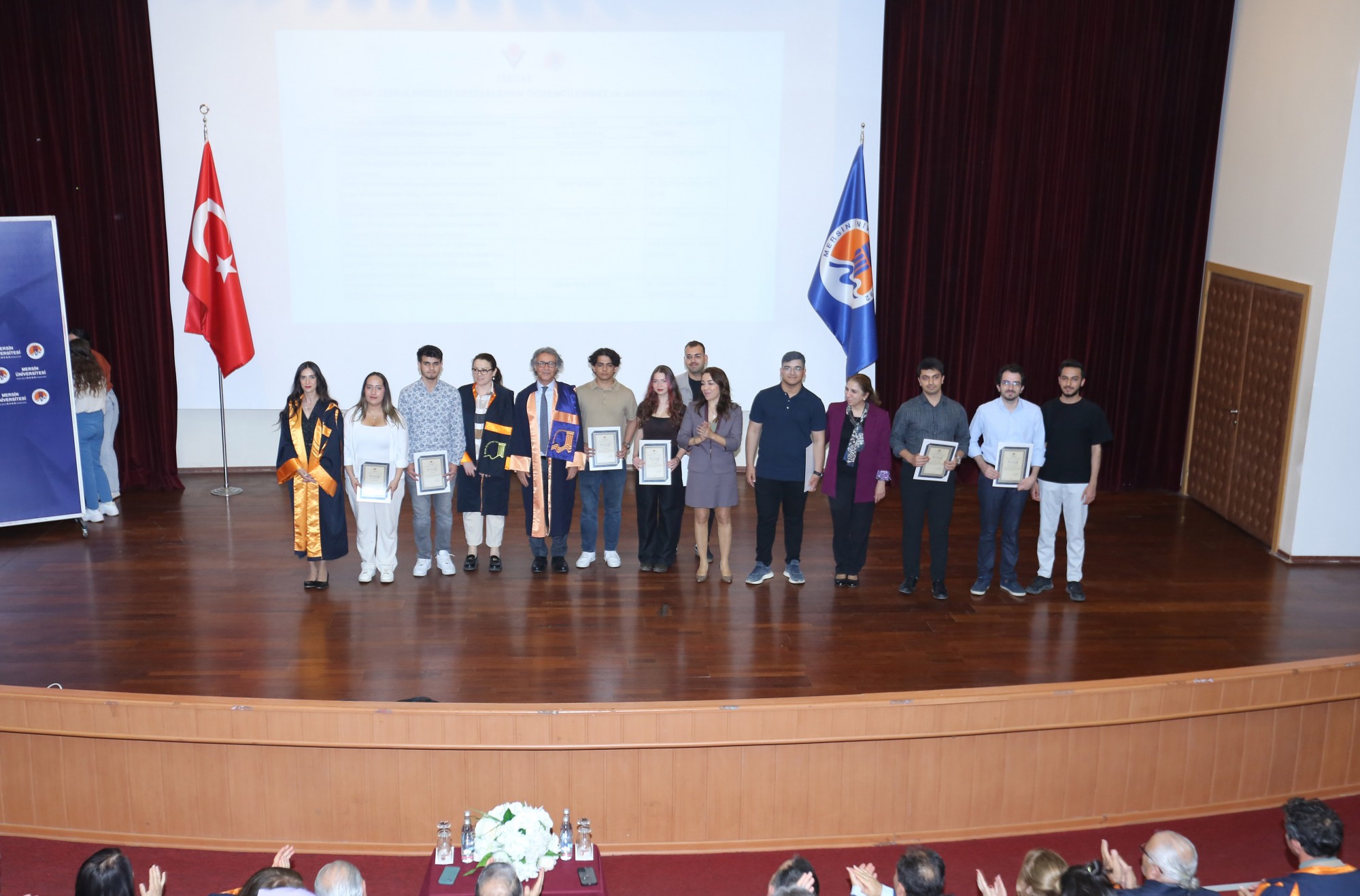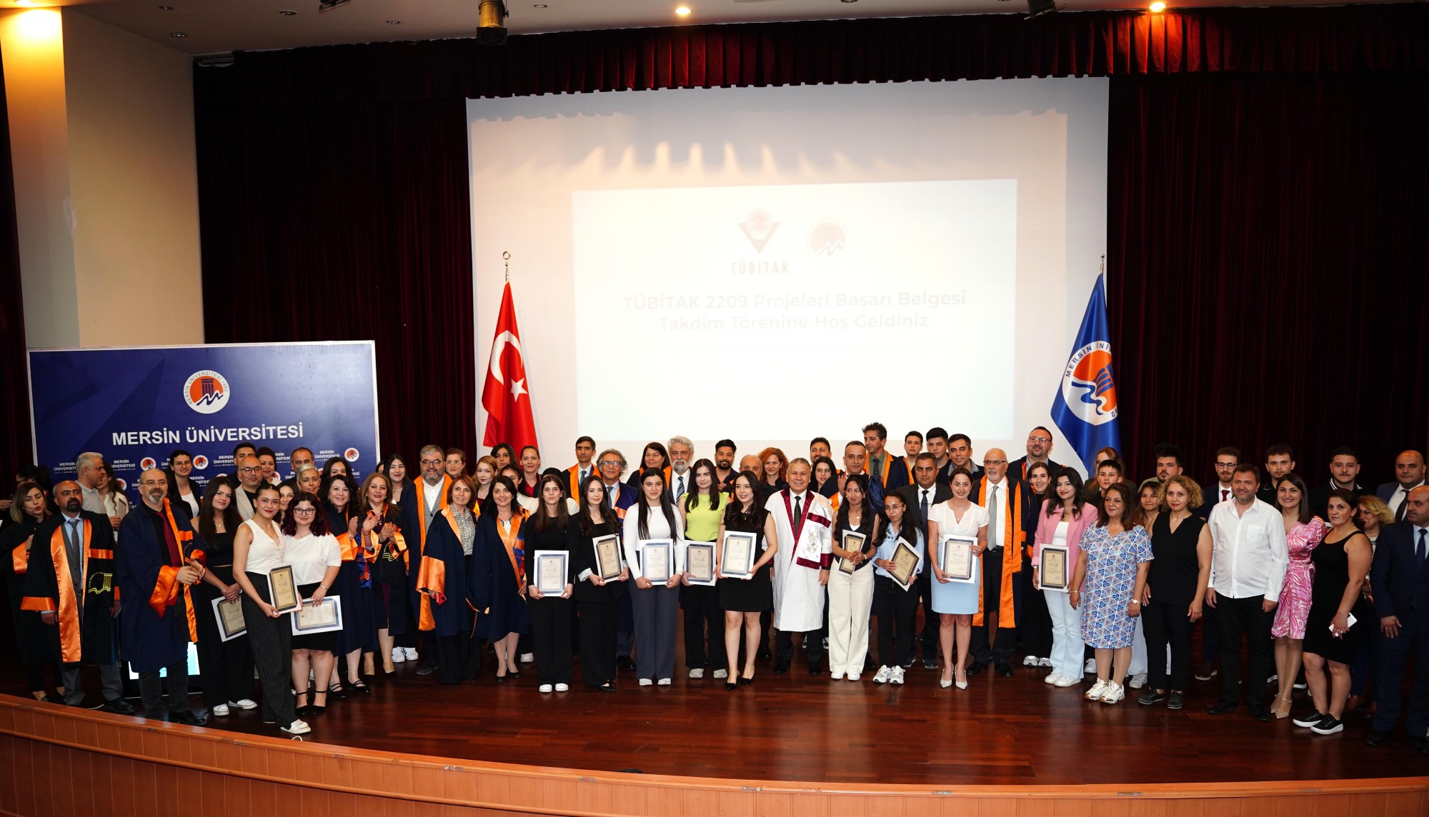 Açış konuşmasının ardından TÜBİTAK 2209-A ve 2209-B programları kapsamında projeleri desteklenmeye hak kazanan öğrencilerimiz ve akademisyenlerimiz tek tek sahneye çağrılarak Rektörümüz, Rektör Yardımcılarımız ve Rektör Danışmanlarımız tarafından başarı belgeleri takdim edildi.