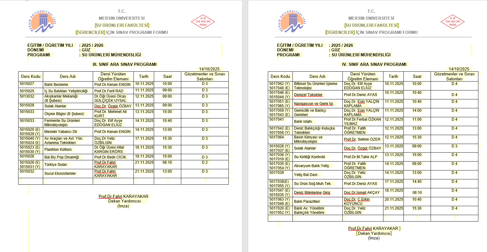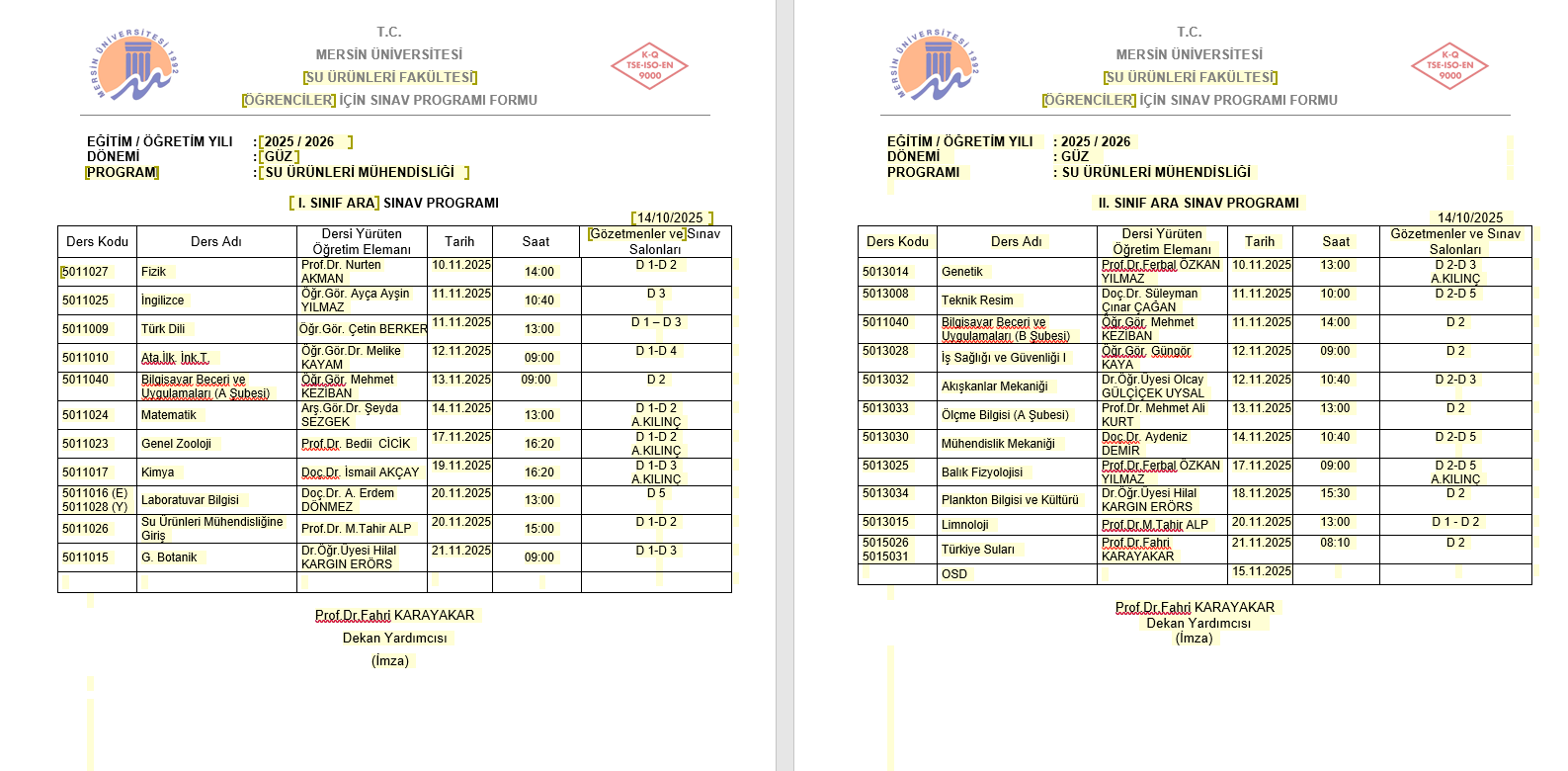 2025-2026 Güz Dönemi Ara Sınav Programı