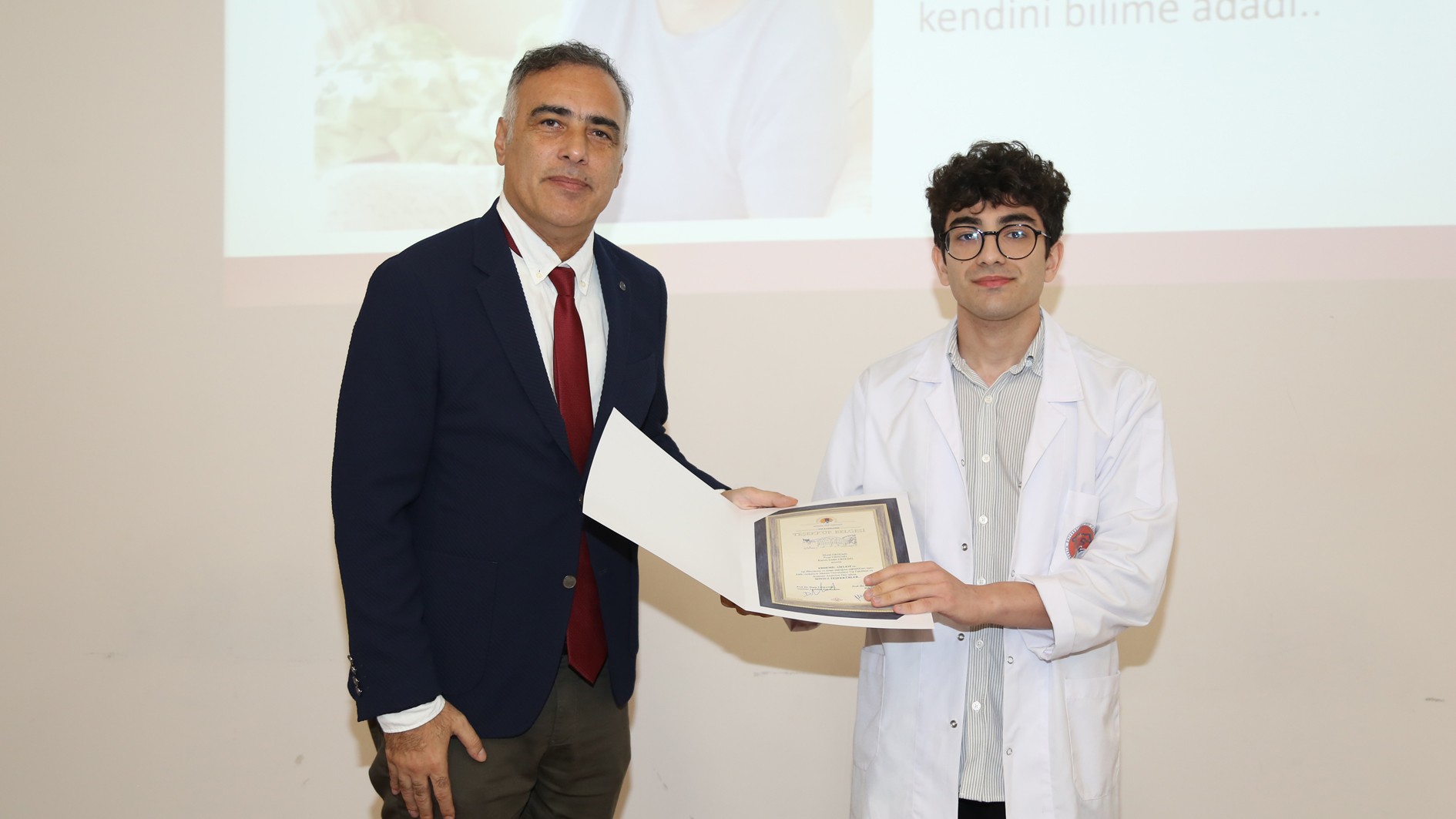 “Tıbbın Sessiz Öğreticilerine Teşekkür Töreni”ne kadavralar hakkındaki duygu ve düşüncelerini içeren yazısıyla katkı sağlayan Tıp Fakültesi Dönem 3 öğrencisi Raul Alakbarli’ye ise Tıp Fakültesi Dekanı Prof. Dr. Murat Ünal tarafından teşekkür belgesi sunuldu.