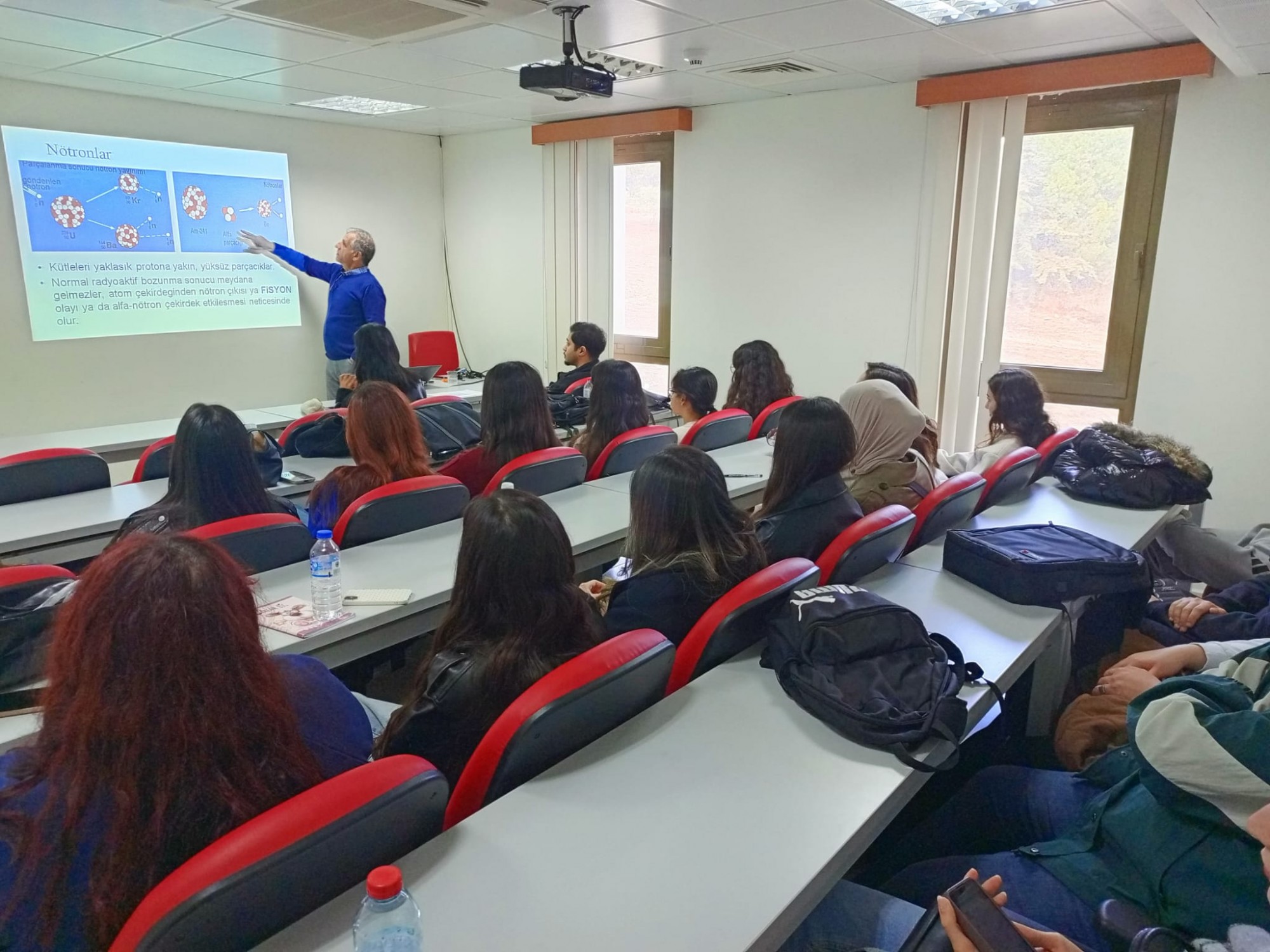 Program kapsamında Prof. Dr. Özdemir, doğal ve yapay radyasyon kaynaklarını ayrıntılarıyla anlatarak bireylerin günlük yaşamda farkında olmadan radyasyona maruz kalabildiğini vurguladı. Öğrencilere, radyasyon güvenliğinde dikkat edilmesi gereken noktalar ve temel korunma prensipleri aktarıldı.