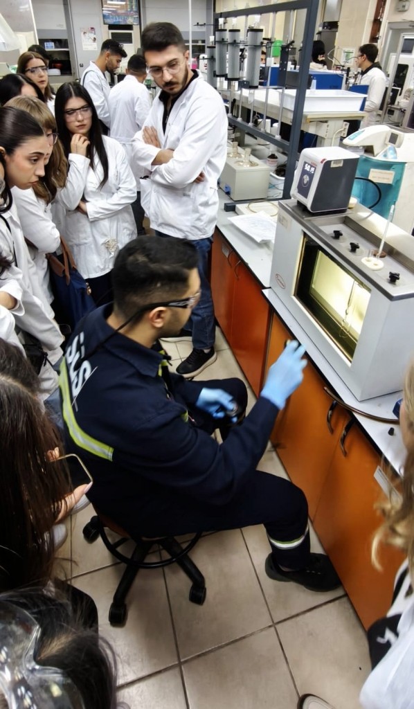 Bölümün mezun öğrencisi Kaan GÜLBURNU’nun Laboratuvar sorumluluğunu yürüttüğü SGS’ de çalışan diğer bölüm mezun öğrencilerimiz Devran YÜKSEL, Mehmet ARSLANKILIÇ, Öznur YERLİKAYA ve Buket METE eşliğinde Laboratuvarda yürütülen faaliyetler ve analizler hakkında bilgiler verilerek, çeşitli yakıt analizleri öğrencilerimiz ile birlikte uygulamalı olarak gerçekleştirildi.