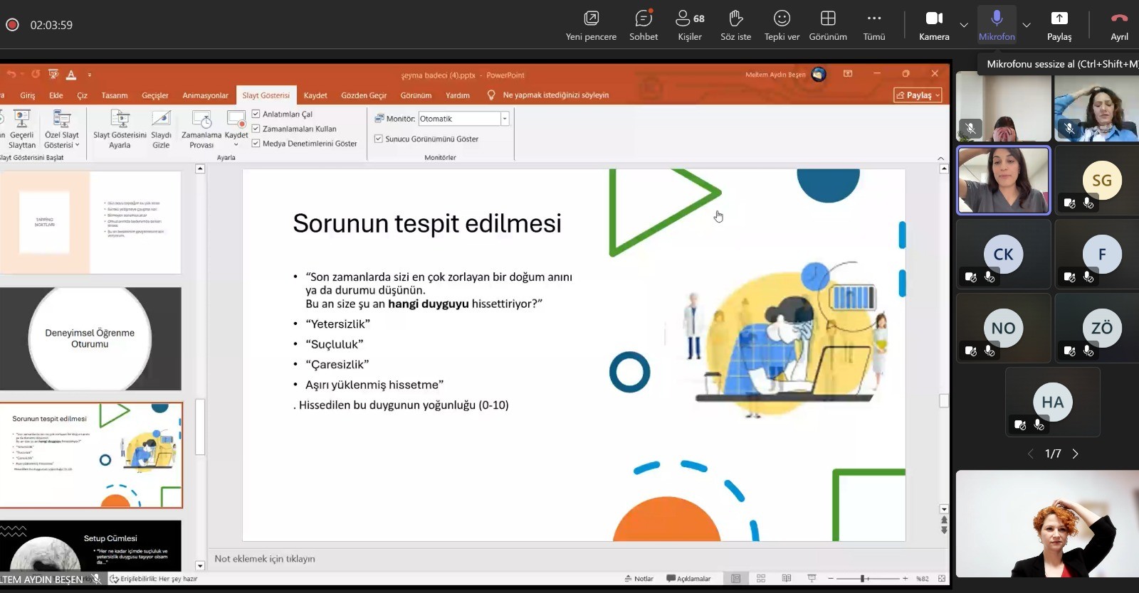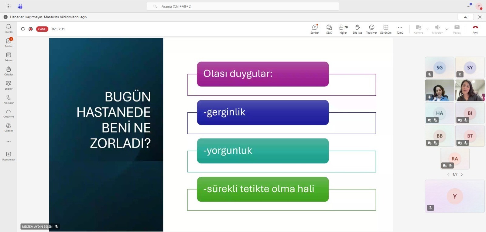 Webinarın moderatörlüğünü Dr. Öğr. Üyesi Sevil Güner üstlenirken, programda alanında uzman akademisyenler ve saha deneyimi bulunan konuşmacılar yer aldı. Etkinlikte, Doç. Dr. Meltem Aydın Beşen tarafından “Ebelerde Duygusal Yük: Tanımı, Kaynakları ve Sonuçları” başlıklı sunum gerçekleştirilerek ebelik mesleğinde duygusal yükün nedenleri ve mesleki etkileri değerlendirildi. Programın ikinci bölümünde Doç. Dr. Saliha Bozdoğan Yeşilot, “Ebelerde Psikolojik Sağlamlık: Koruyucu Faktörler ve Güçlendirme Stratejileri” başlıklı sunumuyla, ebelerin psikolojik iyi oluşunu destekleyen bireysel ve örgütsel faktörleri ele aldı. Webinarın uygulama odaklı bölümünde ise Uzm. Ebe Şeyma Badeci tarafından EFT (Emotional Freedom Techniques) temel bilgilerinin paylaşıldığı ve katılımcıların aktif olarak dahil olduğu bir uygulama atölyesi gerçekleştirildi.