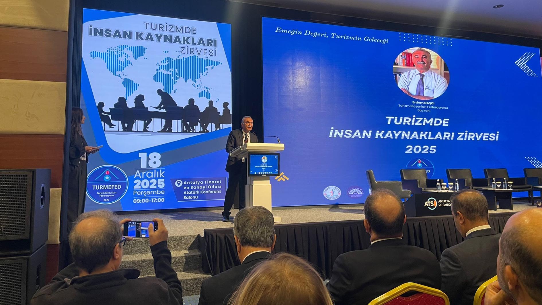 Turizm sektöründe insan kaynağına ilişkin yapısal sorunların ele alındığı Turizmde İnsan Kaynakları Zirvesi, 18 Aralık 2025 tarihinde Antalya Ticaret ve Sanayi Odası Atatürk Konferans Salonunda gerçekleştirildi. Zirveye akademi, kamu ve sektör temsilcileri yoğun ilgi gösterdi. Turizm sektörünün sürdürülebilirliği, hizmet kalitesi ve uluslararası rekabet gücünde belirleyici bir role sahip olan insan kaynağına yönelik yapısal sorunların ele alındığı zirve, sektör, akademi ve sivil toplum temsilcilerini bir araya getirdi.