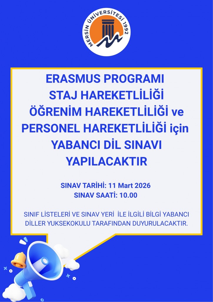 ERASMUS PROGRAMI STAJ HAREKETLİLİĞİÖĞRENİM HAREKETLİLİĞİ ve PERSONEL HAREKETLİLİĞİ için YABANCI DIL SINAVI YAPILACAKTIR.SINAV TARİHİ: 11 Mart 2026 SINAV SAATİ: 10.00 SINIF LİSTELERİ VE SINAV YERİ İLE İLGİLİ BİLGİ YABANCI DİLLER YUKSEKOKULU TARAFINDAN DUYURULACAKTIR.