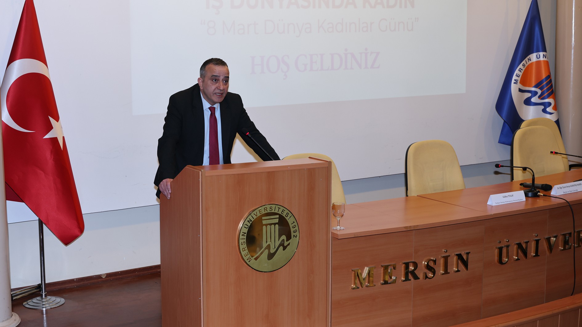 Saygı duruşunda bulunulması ve İstiklal Marşı’nın okunmasının ardından programın açılış konuşmasını yapan Rektör Yardımcımız Prof. Dr. Mehmet Çağrı Çetin, 8 Mart’ın kadınların tarih boyunca verdiği eşitlik, özgürlük ve hak mücadelesini hatırlama günü olduğunu belirterek kadınların toplumların gelişimindeki kritik rolüne değindi. Kadınların bilimde, sanatta ve siyasetteki varlığına rağmen karşılaştıkları zorluklardan bahseden Prof. Dr. Çetin, “Kadınlar, insanlık tarihinin her döneminde toplumların gelişiminde önemli rol oynamışlardır. Bilimde, sanatta, eğitimde, siyasette ve hayatın her alanında kadınların emeği ve katkısı vardır. Ancak ne yazık ki tarih boyunca kadınlar birçok alanda eşitsizliklerle karşılaşmış, haklarını elde etmek için büyük mücadeleler vermek zorunda kalmışlardır.” dedi.