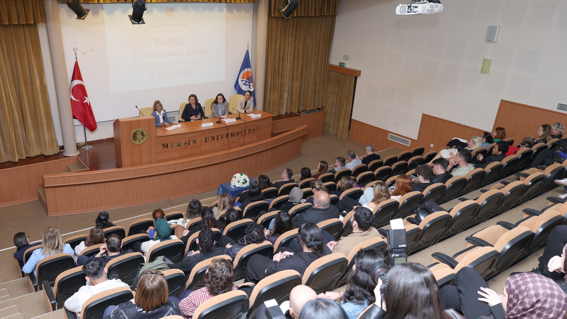 Üniversitemiz Mezun İzleme Koordinatörlüğü tarafından, 5 Mart Perşembe günü Prof. Dr. Uğur Oral Kültür Merkezi C Salonu'nda “8 Mart Dünya Kadınlar Günü: İş Dünyasında Kadın” konulu bir panel düzenlendi. Gerçekleştirilen etkinliğe; Rektör Yardımcımız Prof. Dr. Mehmet Çağrı Çetin, Rektör Danışmanlarımız Prof. Dr. Tuğba Yanpar ve Prof. Dr. Ayla Özer ile akademik personelimiz, idari personelimiz ve öğrencilerimiz katıldı.