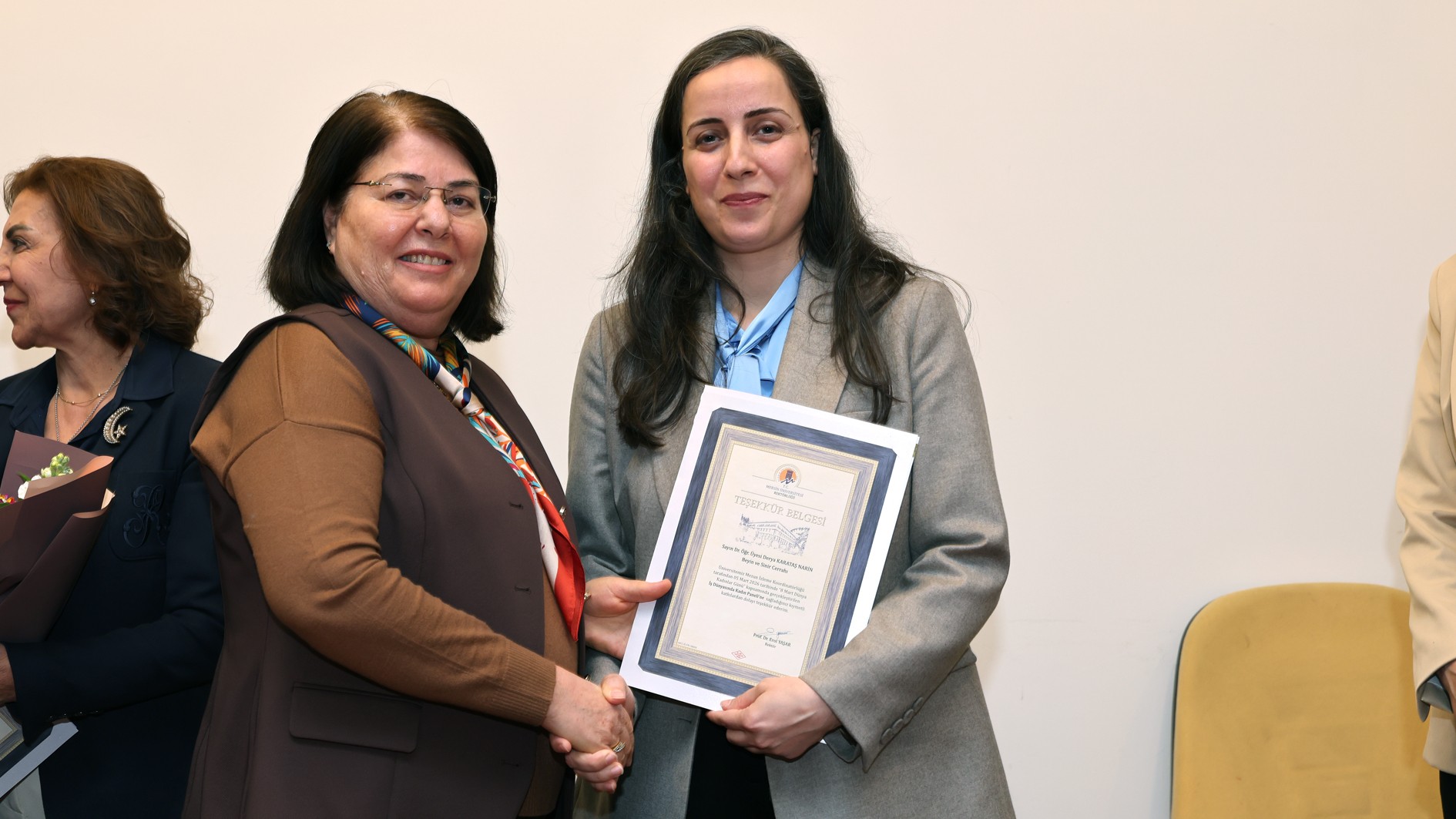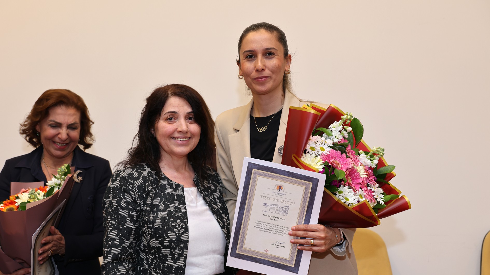 Panel; Rektör Yardımcımız Prof. Dr. Mehmet Çağrı Çetin ile Rektör Danışmanlarımız Prof. Dr. Tuğba Yanpar ve Prof. Dr. Ayla Özer’in panelistlere teşekkür belgesi ve çiçek takdiminin ardından çekilen toplu fotoğrafla sona erdi.