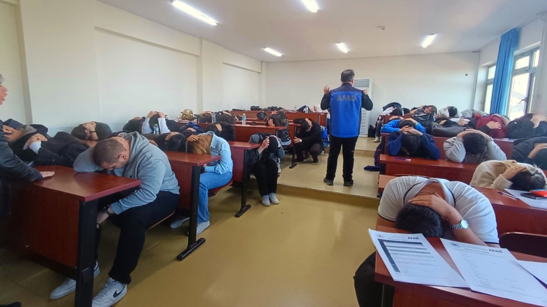 Türkiye’nin deprem riski yüksek bir coğrafyada yer alması nedeniyle afetlere hazırlık kapasitesinin güçlendirilmesinin önemine dikkat çekilen eğitim programında, afet farkındalığı, deprem anında ve sonrasında doğru davranış modelleri, afet iletişimi ve AFAD Gönüllülük Sistemi hakkında bilgi verilerek; öğrencilerin afet durumlarında doğru ve hızlı hareket edebilme becerilerini geliştirmeye yönelik deprem tatbikatı gerçekleştirildi.