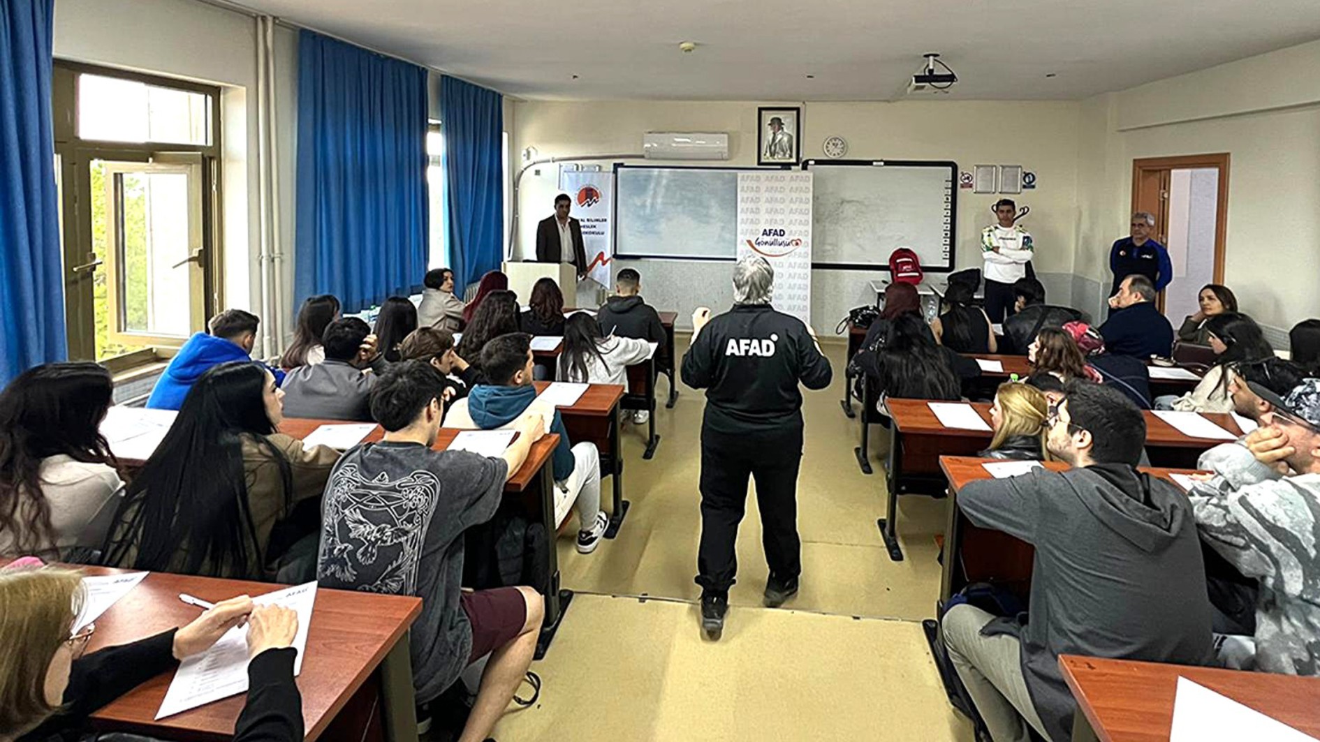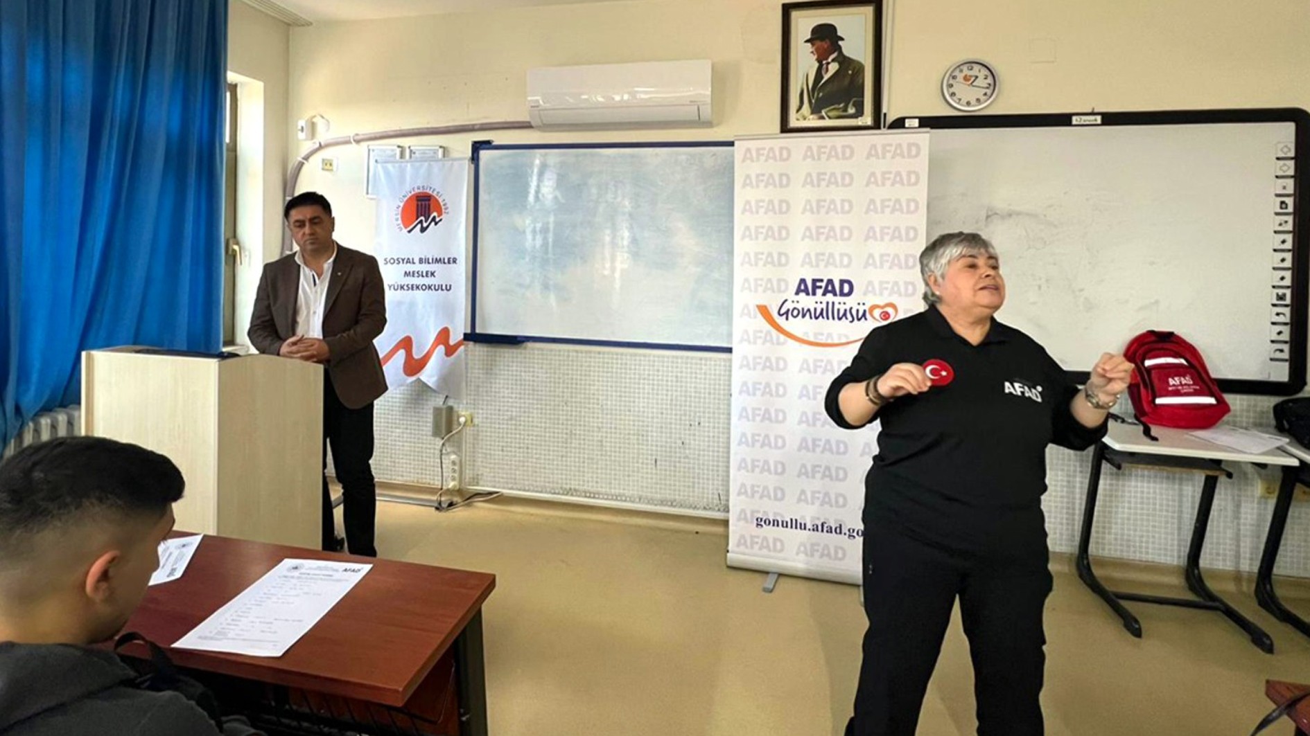 Öğrencilerin afetlere karşı bilinç düzeylerinin artırılması ve doğru davranış biçimlerinin kazandırılması amaçlandığı ekinliğe Yüksekokul Müdürü Doç. Dr. Cevat Ercik, Yüksekokul Müdür Yardımcısı Öğr. Gör. Dr. Emrah Yıldız ile birim öğretim elemanları Öğr. Gör. Dr. Gül Ferhande Canpolat, Öğr. Gör. Dr. Murat Özdamar, Öğr. Gör. Dr. Yunus Doğan, Öğr. Gör. Şeyma Aklan ve Öğr. Gör. Mustafa Bilgiç de katılım sağladı.