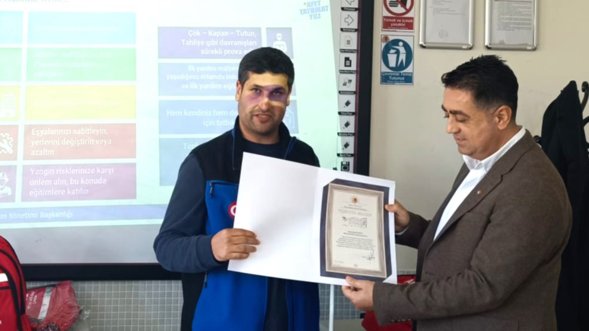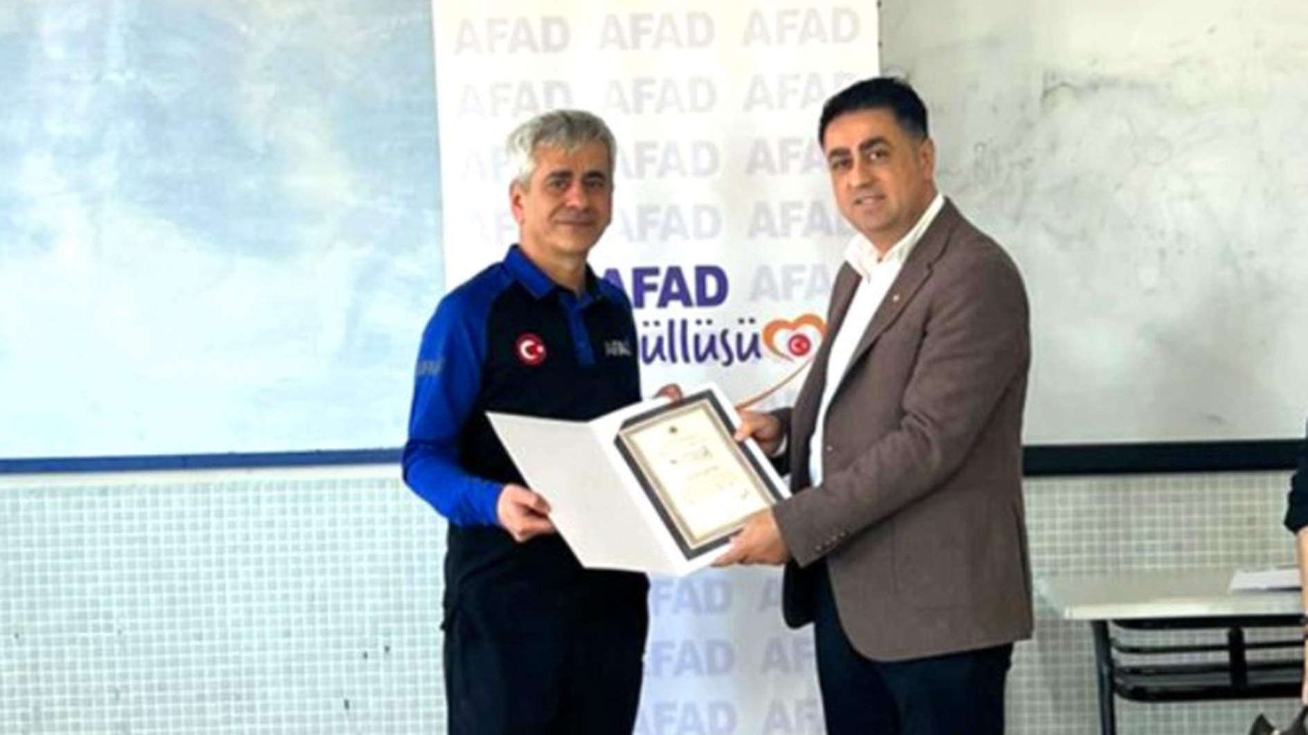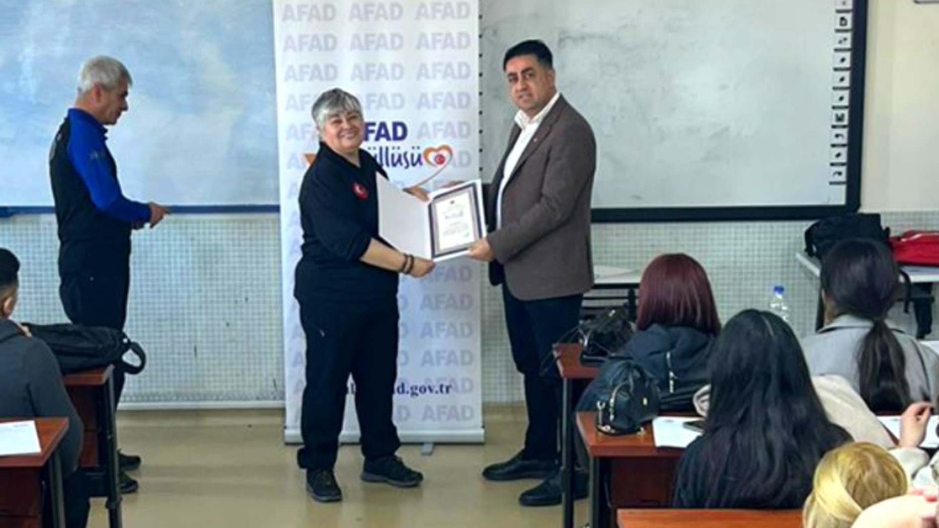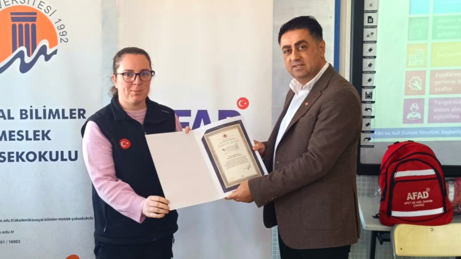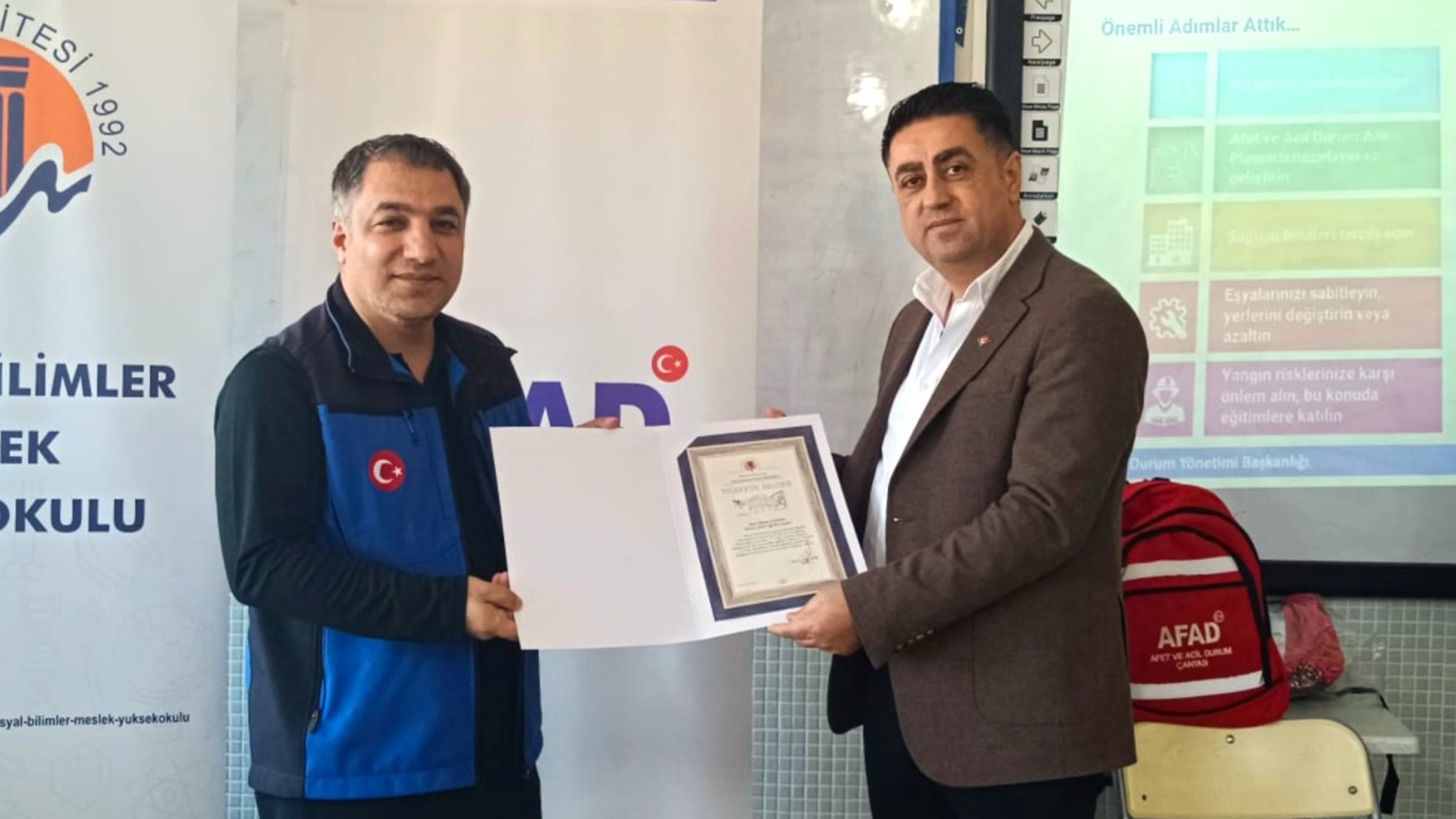 Eğitim programının sonunda, sağladıkları katkılardan dolayı Mersin AFAD yetkililerine Yüksekokul Müdürü Doç. Dr. Cevat Ercik tarafından teşekkür belgeleri takdim edildi.