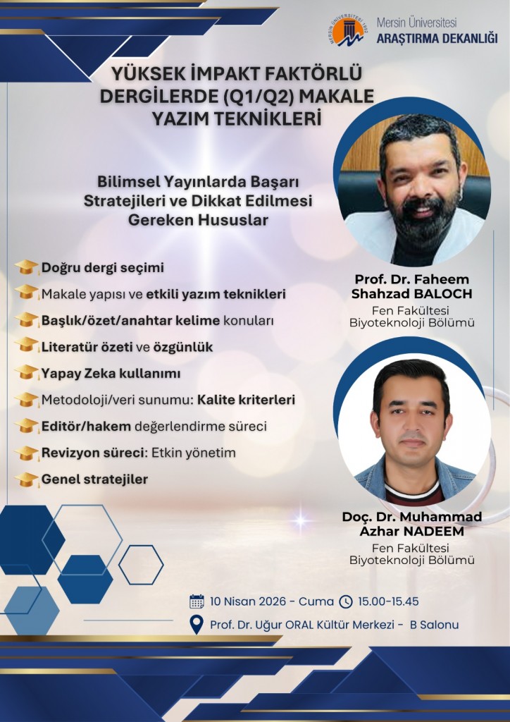 Mersin Üniversitesi Araştırma Dekanlığı, akademisyenlerin ve lisansüstü araştırmacıların uluslararası bilimsel yayın performansını artırmaya yönelik önemli bir etkinliğe ev sahipliği yapıyor. “Yüksek İmpakt Faktörlü Dergilerde (Q1/Q2) Makale Yazım Teknikleri” başlıklı programda, dünyanın önde gelen bilimsel dergilerinde yayın yapmanın stratejileri kapsamlı biçimde ele alınacak.