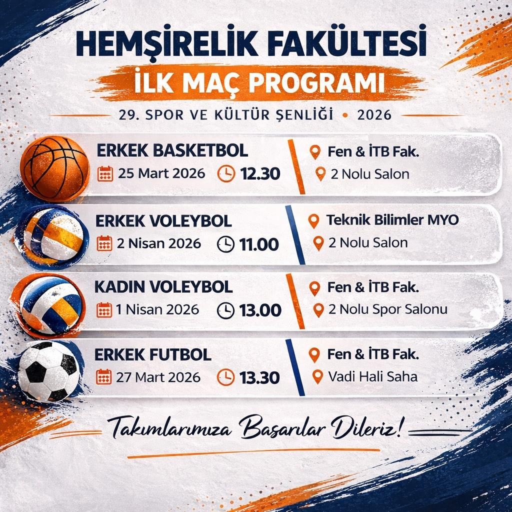 Mersin Üniversitesi Hemşirelik Fakültesi ilk maç programı açıklandı. Fakültemiz öğrencilerinin katılacağı basketbol, voleybol ve futbol karşılaşmalarında tüm öğrencilerimiz ve personelimiz takımlarımızı desteklemeye davetlidir.