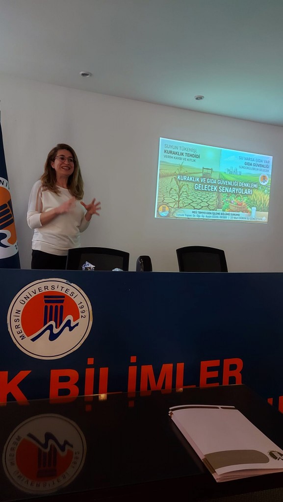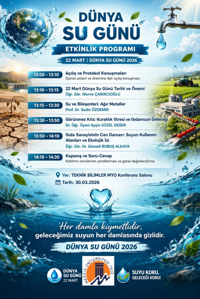 Etkinlik kapsamında Öğr. Gör. Merve ÇARIKCIOĞLU, “22 Mart Dünya Su Günü: Tarihi ve Önemi”; Dr. Öğr. Üyesi Ayşin GÜZEL DEĞER, “Görünmez Kriz: Kuraklık Stresi ve Gıdamızın Geleceği”; Öğr. Gör. Dr. Günseli BOBUŞ ALKAYA ise “Gıda Sanayisinin Can Damarı: Suyun Kullanım Alanları ve Ekolojik İzi” başlıklı sunumlarıyla programa katkı sundu.