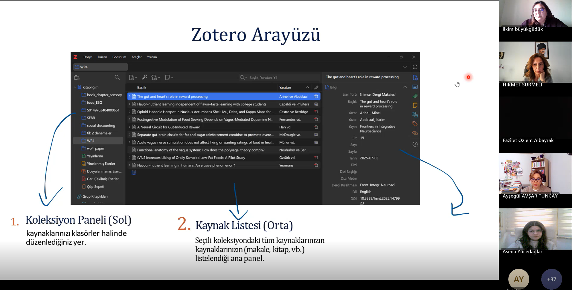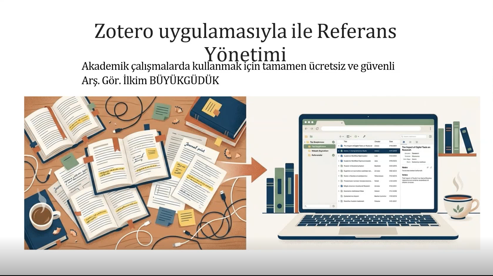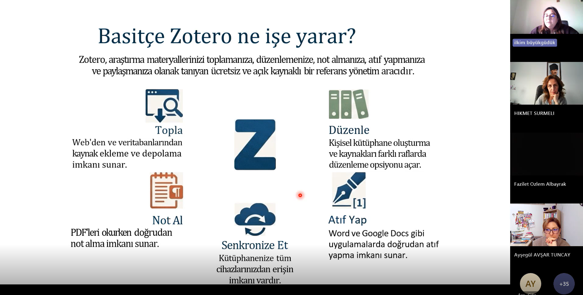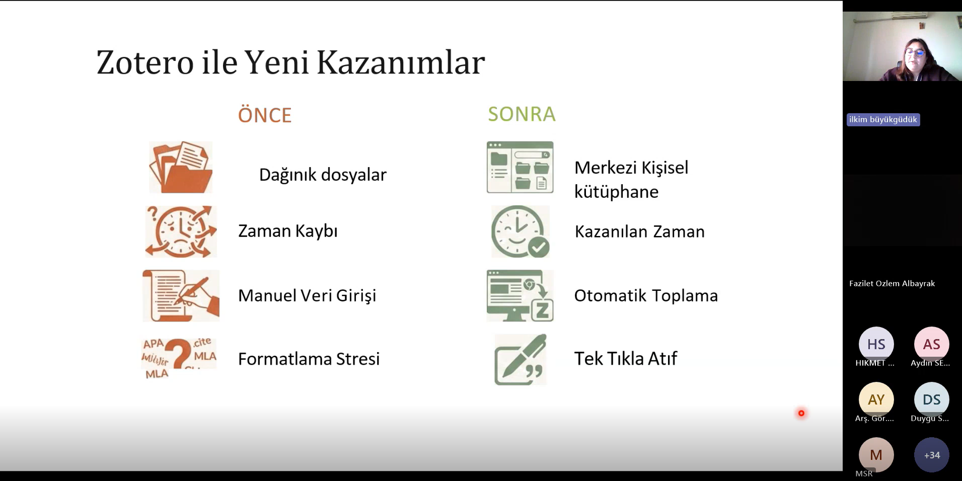 Ardışık iki oturum halinde düzenlenen webinarın ilk bölümünde Arş. Gör. İlkim BÜYÜKGÜDÜK ÇETİN, "Zotero ile Kaynakça Yazımı" eğitimini verdi. Özellikle akademik yazım sürecinin en titiz aşamalarından biri olan kaynak yönetimi ve atıf verme süreçlerinin Zotero yazılımı ile nasıl hatasız ve hızlı bir şekilde yönetilebileceği uygulamalı örneklerle anlatıldı.