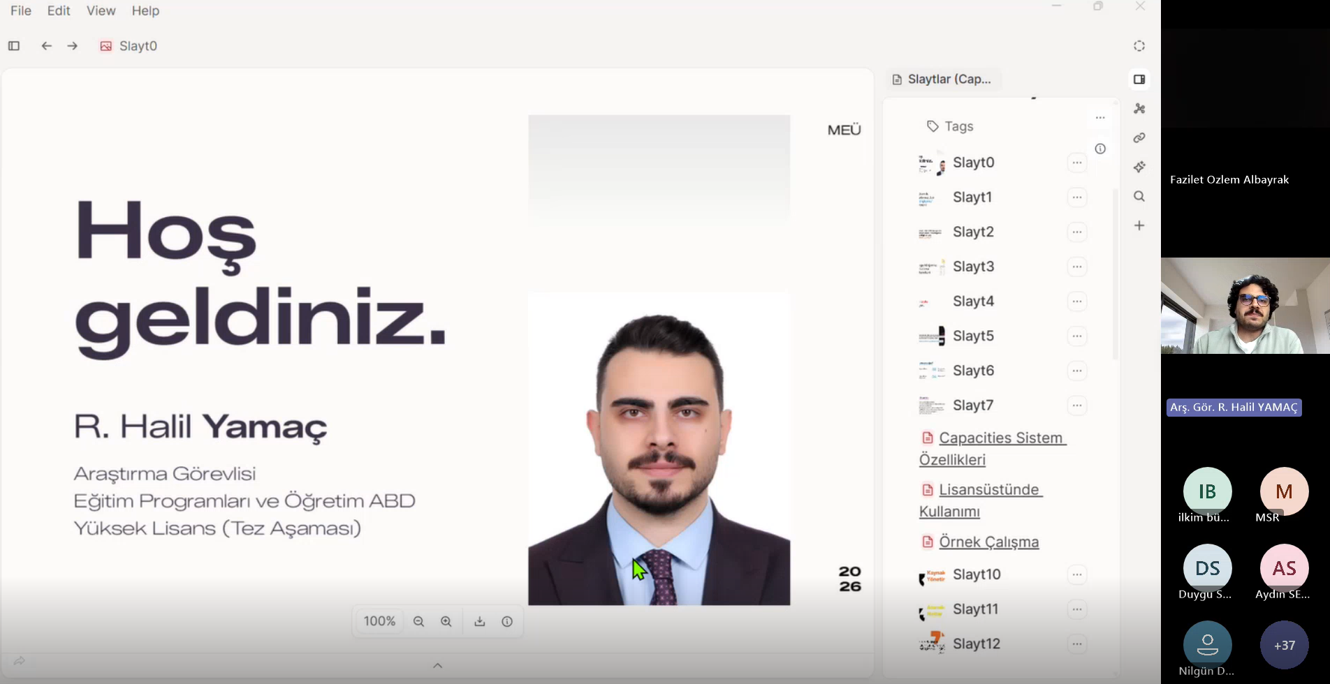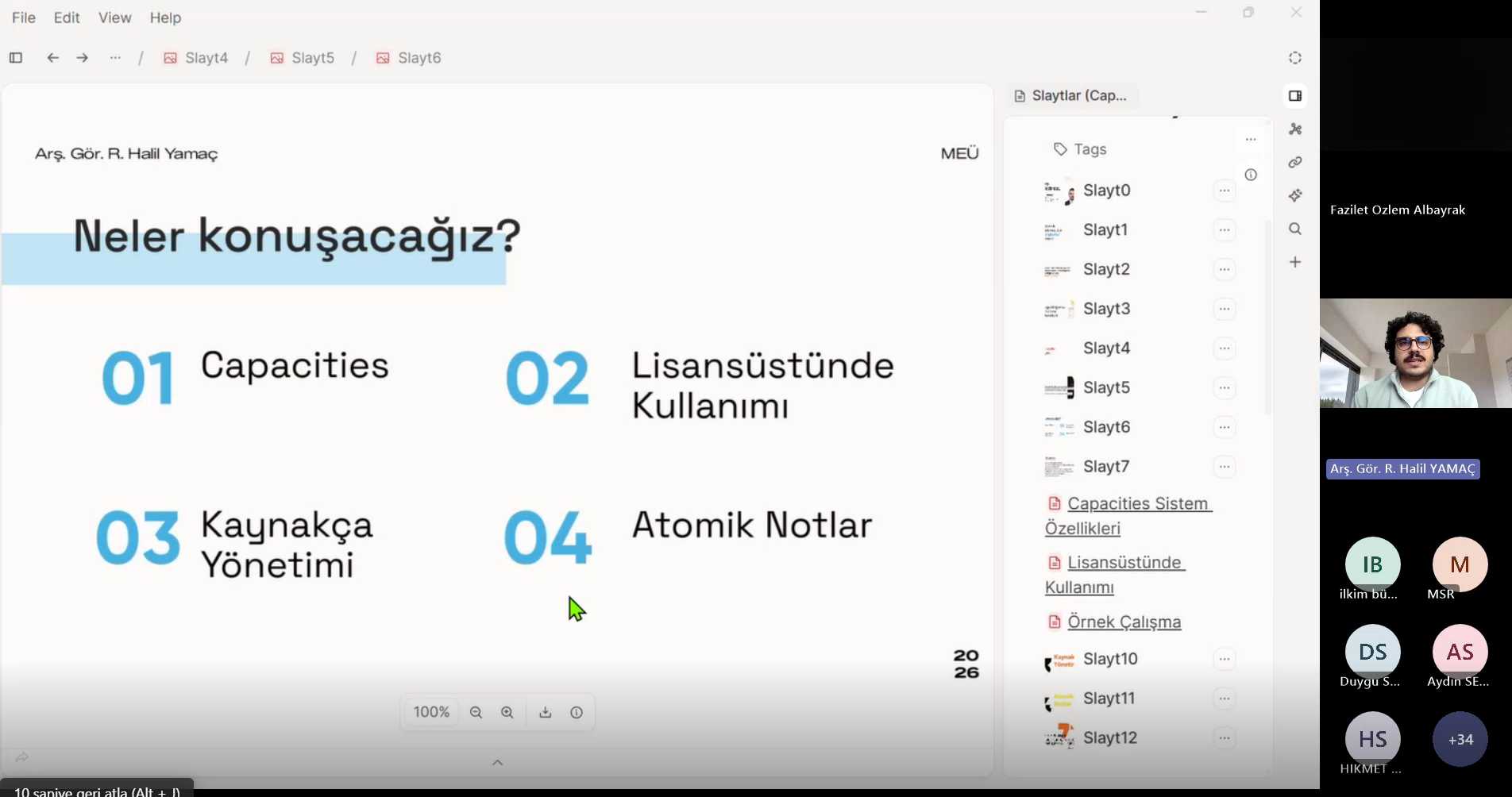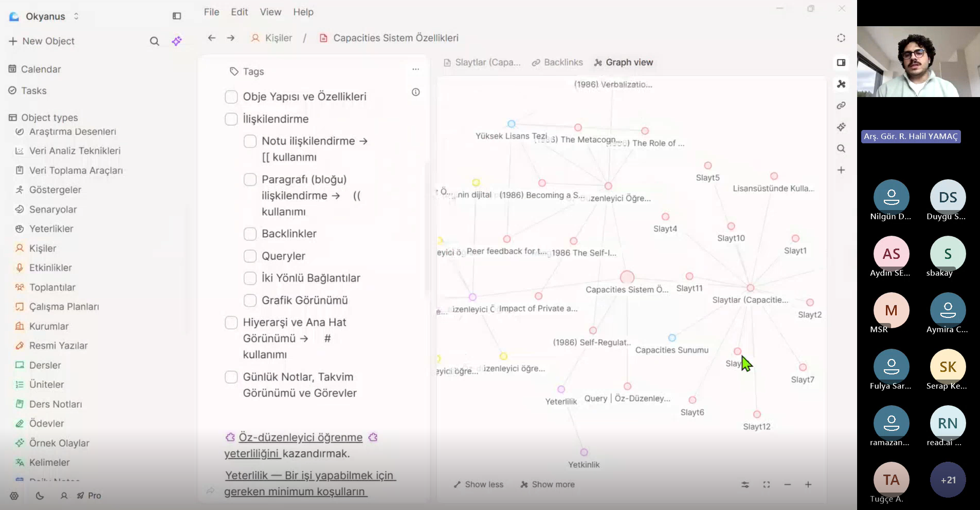 Programın ikinci bölümünde ise Arş. Gör. Rükneddin Halil YAMAÇ, "Akademisyenler için Dijital Çalışma Ekosistemi" başlıklı sunumunda Capacities platformunu tanıttı. Klasik hiyerarşik dosya ve klasörleme mantığının ötesine geçen Capacities'in, akademisyenlerin günlük çalışma rutinlerini nasıl daha sistematik ve verimli hale getirebileceklerine dair stratejiler paylaştı.