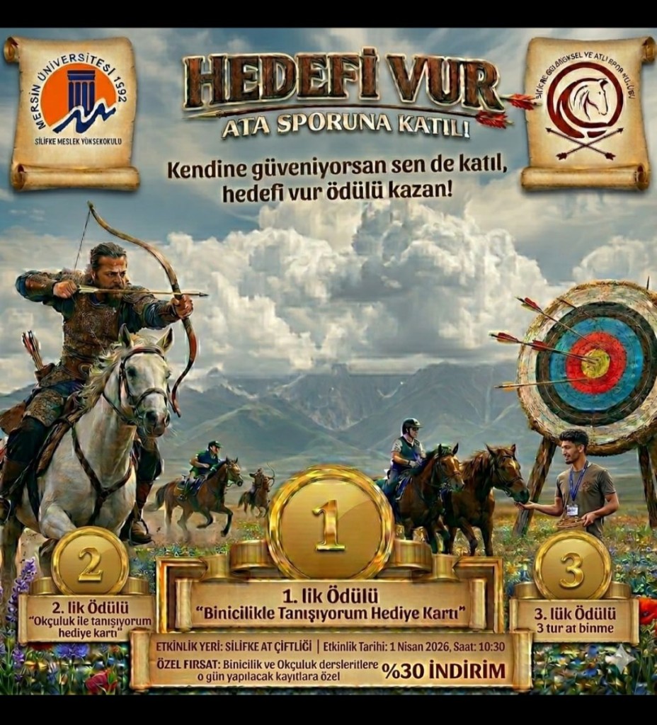 Mersin Üniversitesi Silifke Meslek Yüksekokulu öncülüğünde “Hedefi Vur – Ata Sporuna Katıl” etkinliği, 1 Nisan 2026 tarihinde Silifke At Çiftliği’nde gerçekleştirildi.