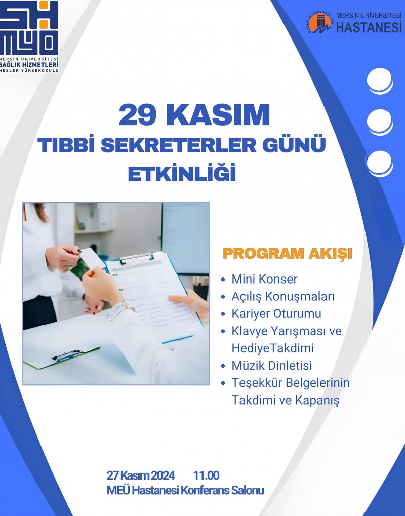 Mersin Üniversitesi Sağlık Hizmetleri Meslek Yüksekokulu bünyesinde yer alan Tıbbi Dokümantasyon ve Sekreterlik Programı, sağlık kurumlarında hasta kayıtlarının düzenlenmesi, arşivlenmesi, kodlanması ve sağlık bilgi sistemlerinin etkin kullanımı gibi alanlarda mesleki bilgi ve beceriler kazandırmayı amaçlayan iki yıllık bir ön lisans programıdır. Öğrenciler; sağlık terminolojisi, tıbbi dokümantasyon teknikleri, sağlık bilgi yönetim sistemleri, hasta kayıt ve arşiv düzeni, tıbbi yazışma ve sekreterlik uygulamaları gibi konularda hem teorik hem de uygulamalı eğitim almaktadır. Program mezunları, “Tıbbi Sekreter” unvanı ile kamu ve özel hastanelerde, aile sağlığı merkezlerinde, polikliniklerde ve çeşitli sağlık kuruluşlarında istihdam edilmektedir.