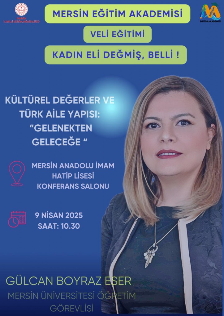 Üniversitemiz Rehberlik ve Psikolojik Danışmanlık Uygulama ve Araştırma Merkezi bünyesinde görev yapmakta olan Öğr. Gör. Gülcan Boyraz Eser, Mersin İl Milli Eğitim Müdürlüğü tarafından yürütülen "Kadın Eli Değmiş, Belli! " projesi kapsamında 09 N