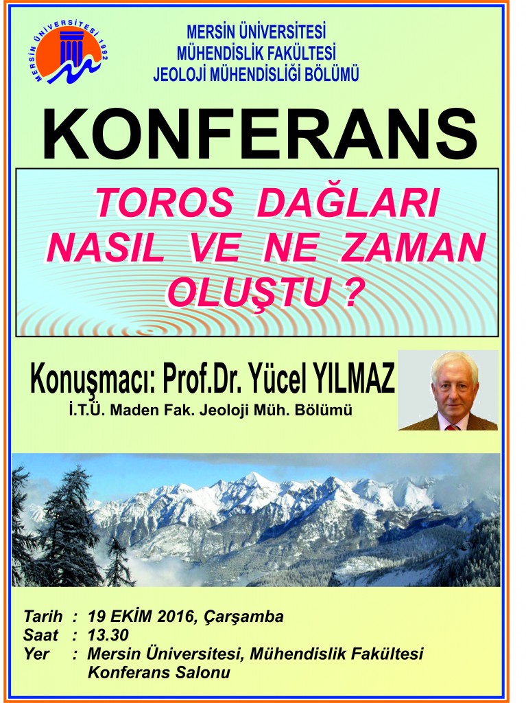 Mersin Üniversitesi Jeoloji Mühendisliği bölümü tarafından İTÜ Maden Fakültesi Jeoloji Mühendisliği Bölümü Öğretim Üyesi Sayın Prof. Dr. Yücel YILMAZ'ın sunumuyla "Toros Dağları Nasıl ve Ne Zaman Oluştu?" adlı konferans düzenlenecektir.