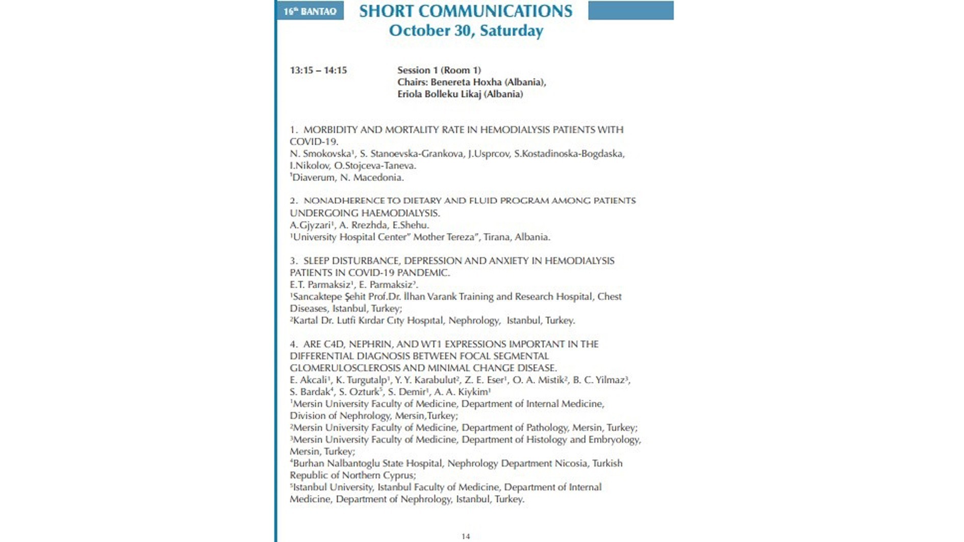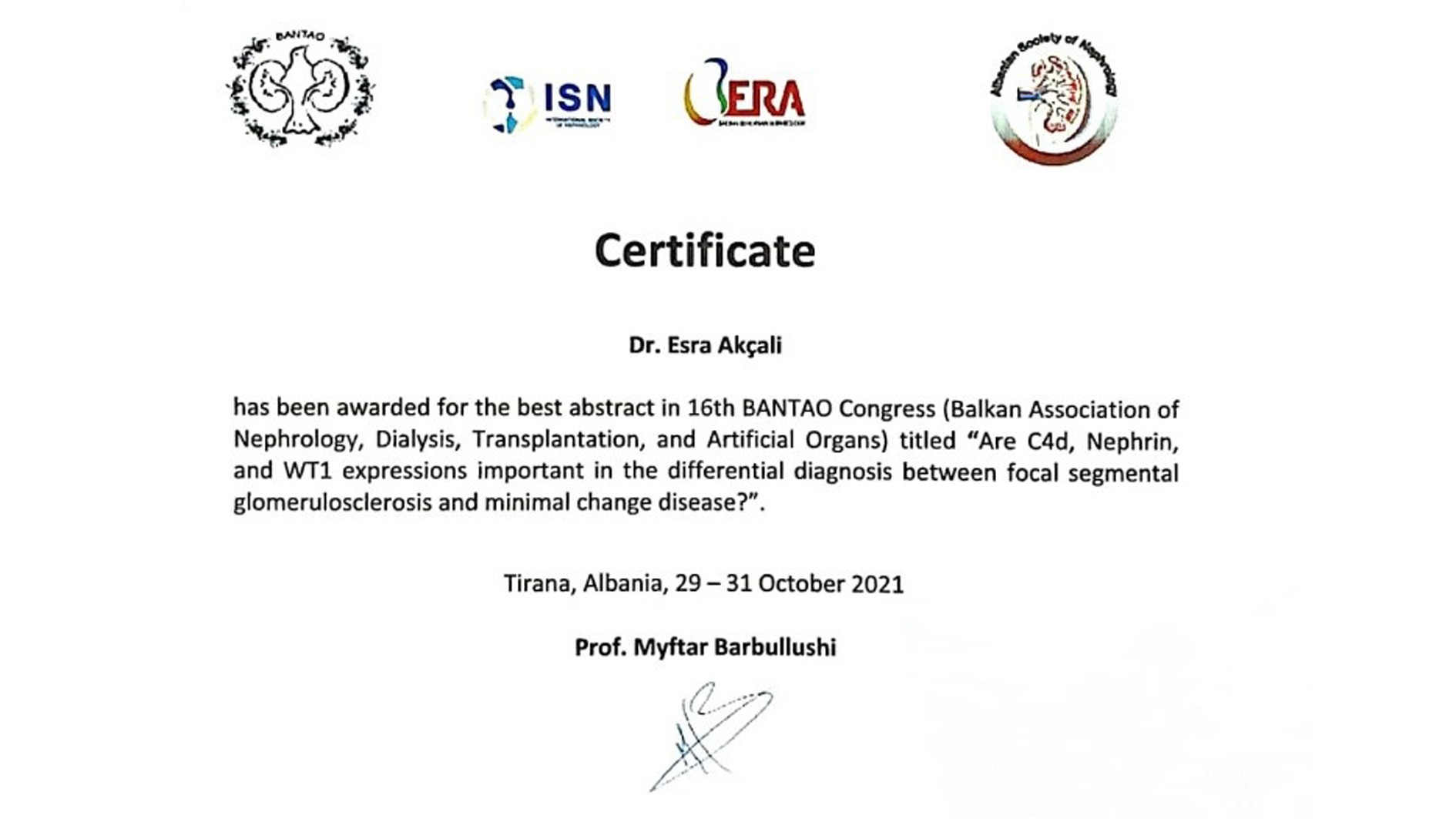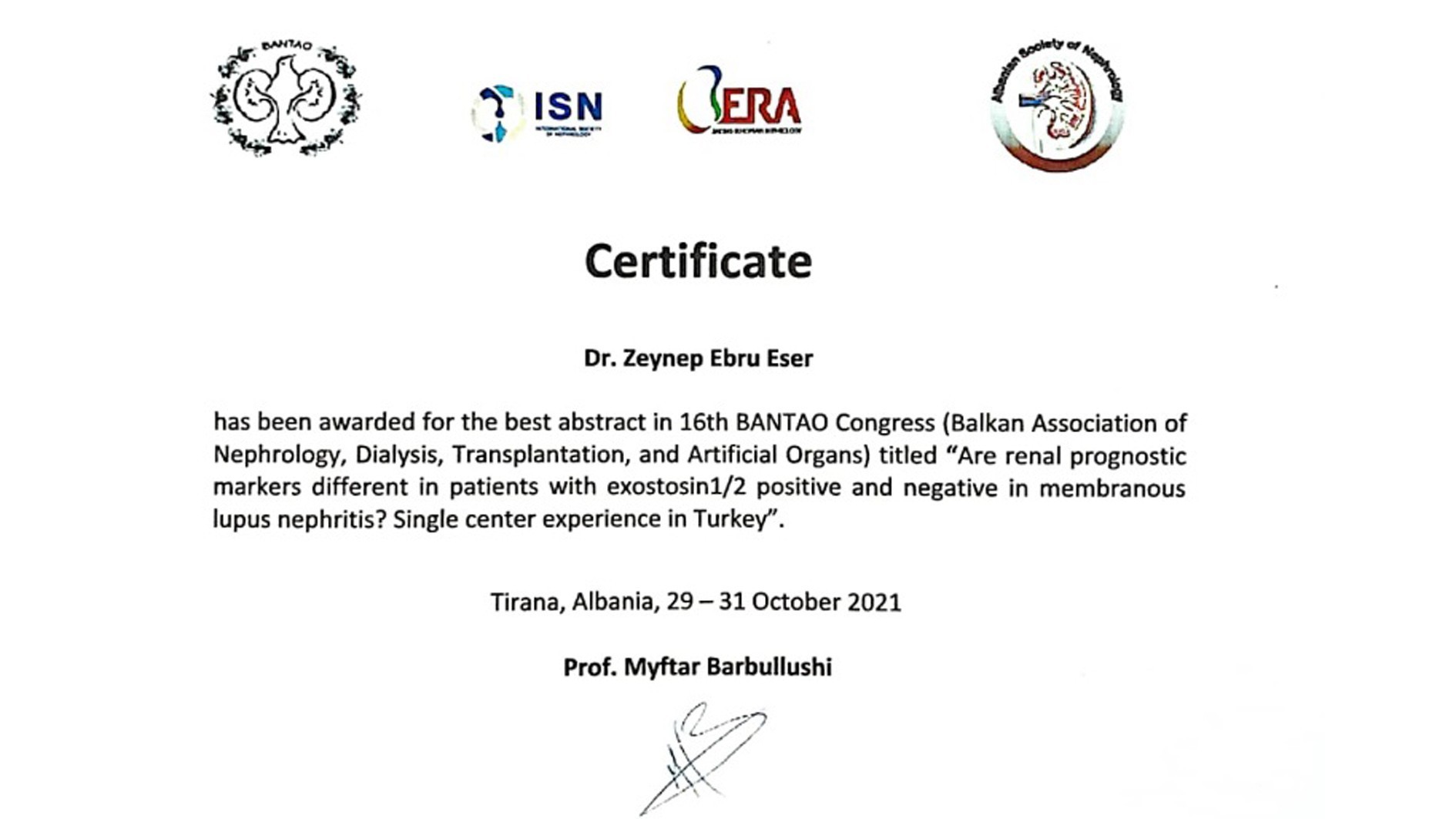 Fakültemiz İç Hastalıkları AD/Nefroloji Bilim Dalı öğretim üyeleri Prof. Dr. Ahmet Alper Kıykım, Prof. Dr. Serap Demir, Prof. Dr. Kenan Turgutalp, Uzm. Dr. Esra Akçalı, Uzm. Dr. Zeynep Ebru Eser, Patoloji AD öğretim üyeleri Doç. Dr. Yasemin Yuyucu Karabulut, Dr. Özge Ağtaş Mıstık, Dr. Emre Çağatay Köse ve Histoloji-Embriyoloji Bilim Dalı öğretim üyelerimiz Prof. Dr. Banu Coşkun Yılmaz, Prof. Dr. Ebru Ballı hazırladıkları “Are renal prognostic markers different in patients with exostosin1/2 positive and negative in membranous lupus nephritis? single center experience in TURKEY” ve “Are C4d, nephrin, and WT1 expressions important in the differential diagnosis between focal segmental glomerulosclerosis and minimal change disease” isimli çalışmaları ile 15 ülkenin katıldığı ve 60 sözlü sunumun olduğu Uluslararası 16. BANTAO Kongresi’nde en iyi ikinci ve üçüncü bildiri ödülü aldı.