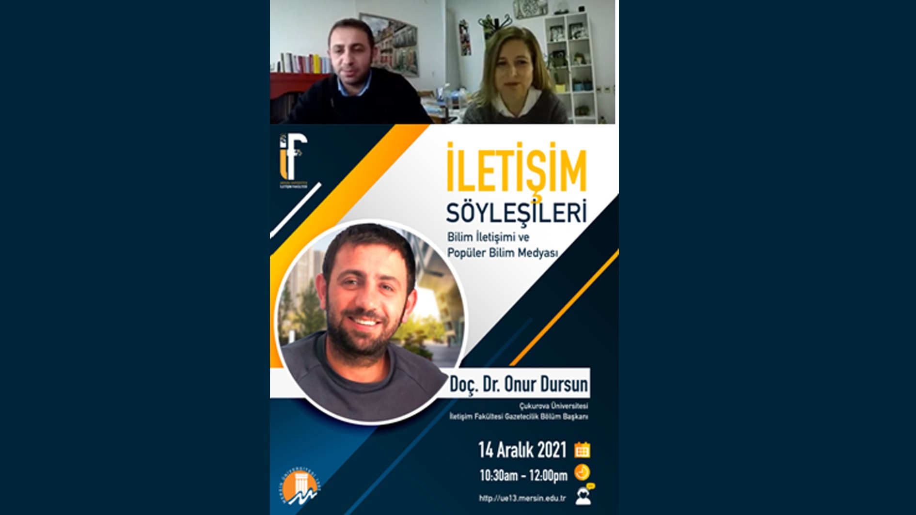 Üniversitemiz İletişim Fakültesi tarafından düzenlenen “İletişim Söyleşileri” 2021-2022 Eğitim-Öğretim yılında çevrim içi ortamda öğrencileri sektörün önemli isimleriyle buluşturmaya devam ediyor. Söyleşinin bu haftaki konuğu Çukurova Üniversitesi İletişim Fakültesi Gazetecilik Bölüm Başkanı Doç. Dr. Onur Dursun oldu.