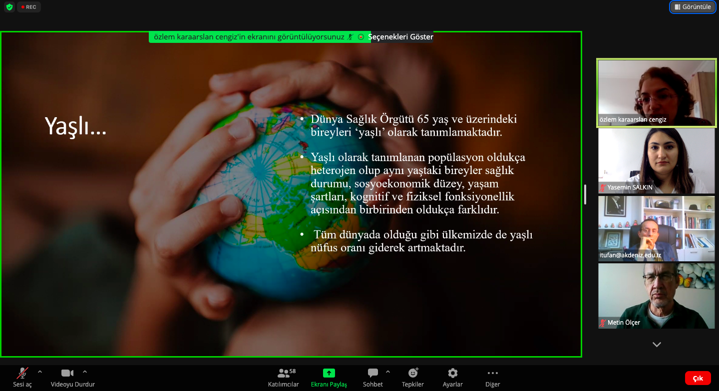 Aynı panel kapsamında Mersin Üniversitesi Tıp Fakültesi Dahiliye Anabilim Dalı Geriatri Bölümü Öğretim Üyesi sayın Doç. Dr. Özlem KARAASLAN CENGİZ “Yaşlılarda İhmal ve İstismar” konusu ele aldı. İhmal ve istismarın önemi, tanımı, istismar türleri, yaygınlığı, risk faktörleri, yaşlı ihmali ve istismarı ile mücadele konularına değindi. Yaşlı ihmali ve istismarının önemli ve çok boyutlu bir halk sağlığı sorunu olduğunu ifade eden Sayın KARAASLAN CENGİZ, ihmal ve istismarı önleyebilmek için risk faktörlerinin iyi bilinmesi gerektiğini ifade etti. Yaşlıların istismarı ifade edemeyebileceğini ve bu konuda sağlık personelinin tutumunun nasıl olması gerektiğini anlattı. İstismara yönelik önleyici müdahalelerin geliştirilmesinin ve toplumda yaşlı istismarına dair farkındalığı arttırmanın gerekliliğine vurgu yaptı. Yaşlı istismarı ve ihmali ile mücadele kapsamında sağlık çalışanları, bakım verenler, hastalar ve toplumun eğitilmesi gerektiğini ifade etti. Bununla birlikte, yaşlıların mümkün olduğunca aktif yaşam sürebilmeleri için olanaklar sunulmasının da önemine de dikkat çekti.