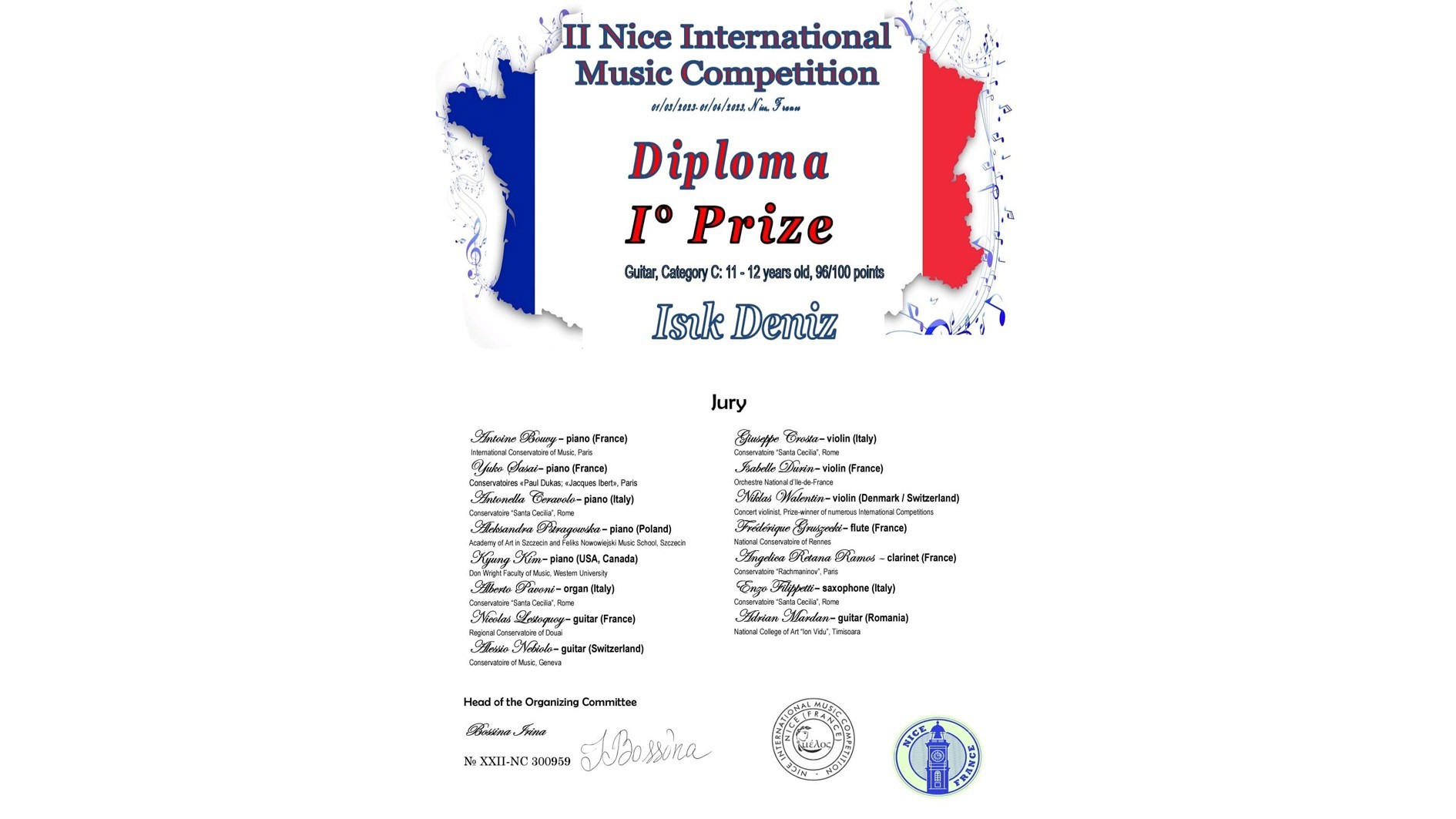 Yarışma sonucuna göre Konservatuvarımız gitar eğitmenlerinden Dr. Öğr. Üyesi Mehmet Özkanoğlu'nun öğrencilerinden Deniz Işık, sergilediği performans ile 11-12 yaş kategorisinde birincilik ödülüne layık görüldü. Öğrencimiz bu başarısıyla, uluslararası alanda ülkemizi ve Üniversitemizi başarıyla temsil etmiş oldu.