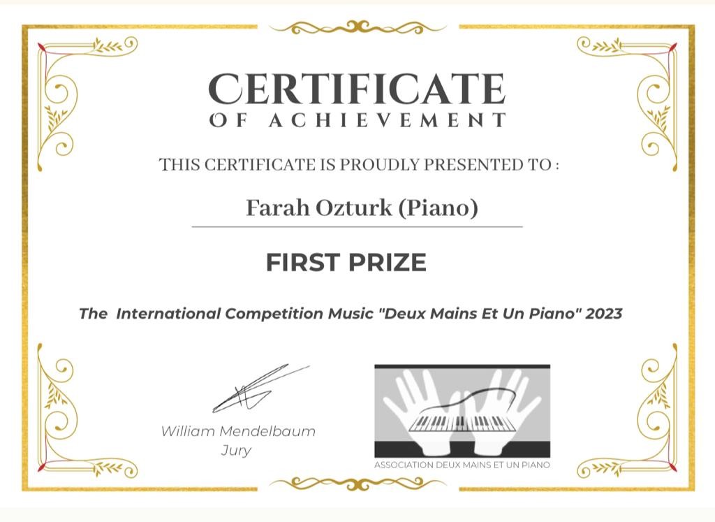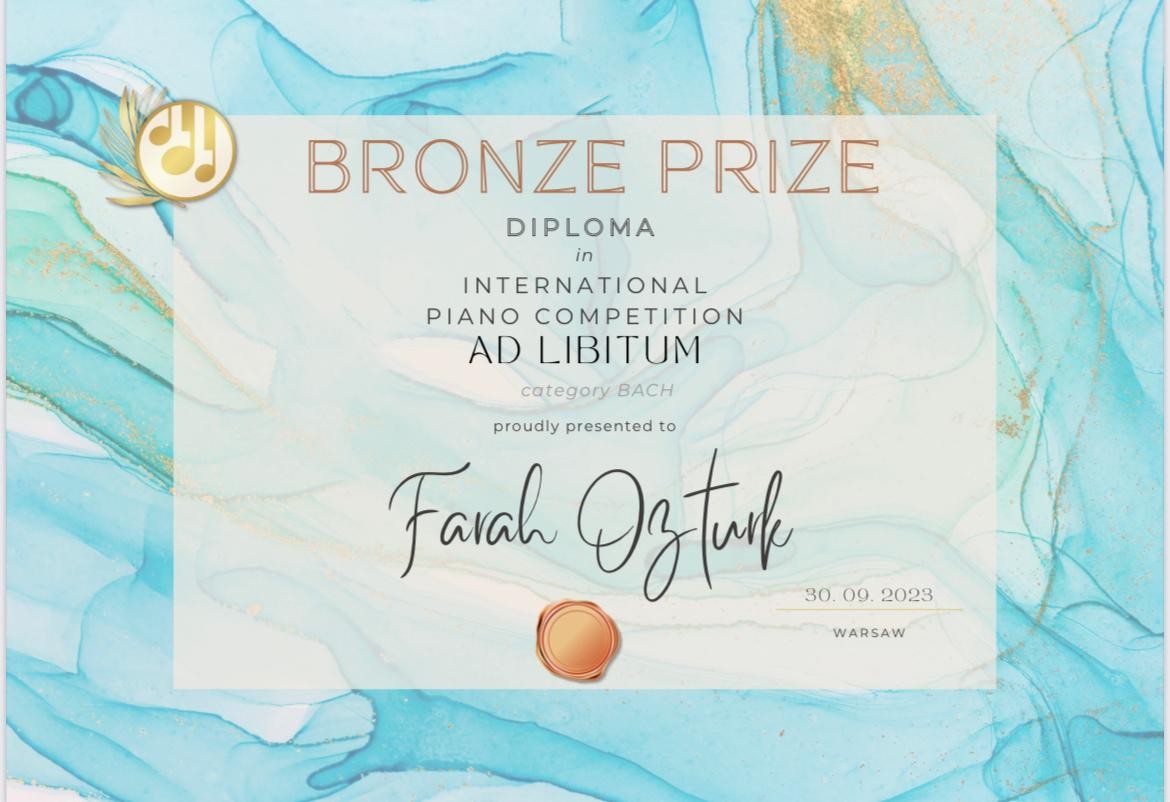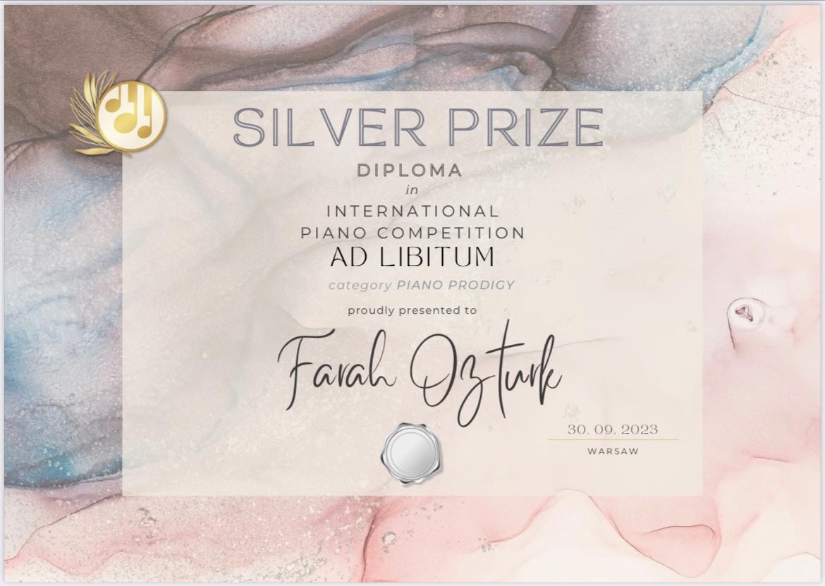 Yarı zamanlı piyano öğrencimiz Farah Öztürk, Polonya merkezli düzenlenen uluslararası Ad Libitum International Piano Yarışması’nda üç ayrı kategoride ödül aldı. Öğrencimiz kendi yaş grubunda (piano prodigy) genel kategoride gümüş madalya, 20. yüzyıl kategorisinde gümüş madalya ve Bach kategorisinde ise bronz madalya aldı. Kısa bir süre sonra aynı öğrencimiz Fransa merkezli yapılan "Deux Mains Et Un piano" yarışmasında da birincilik ödülünün sahibi oldu.
