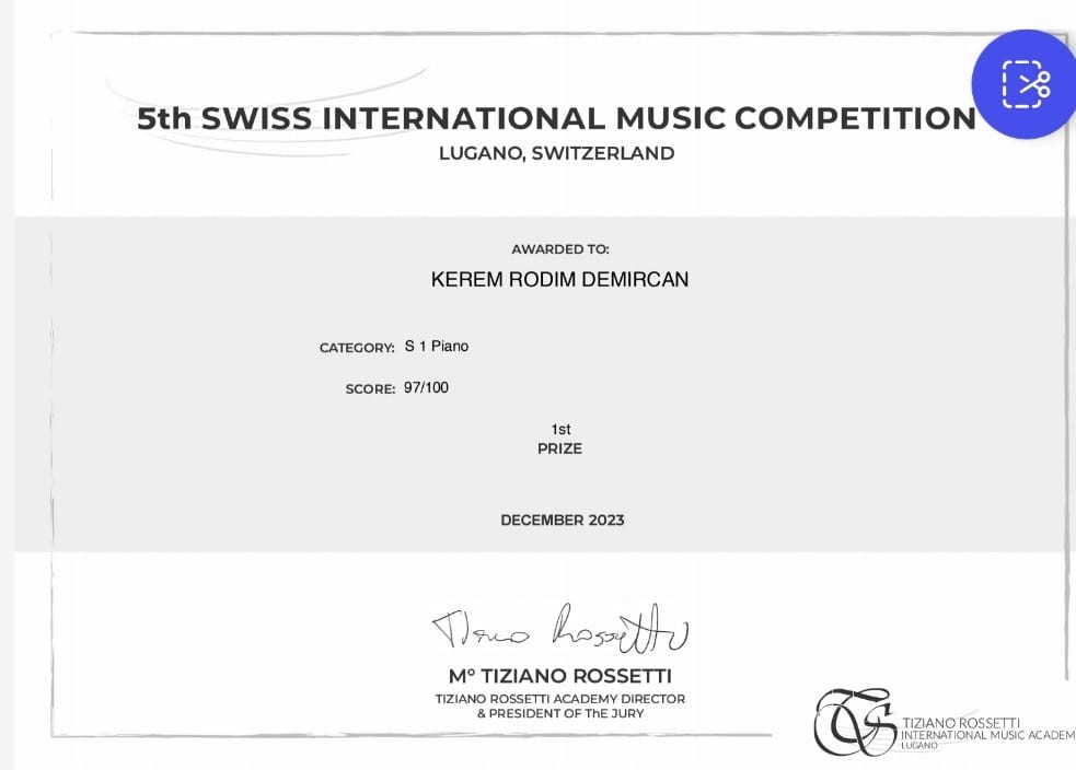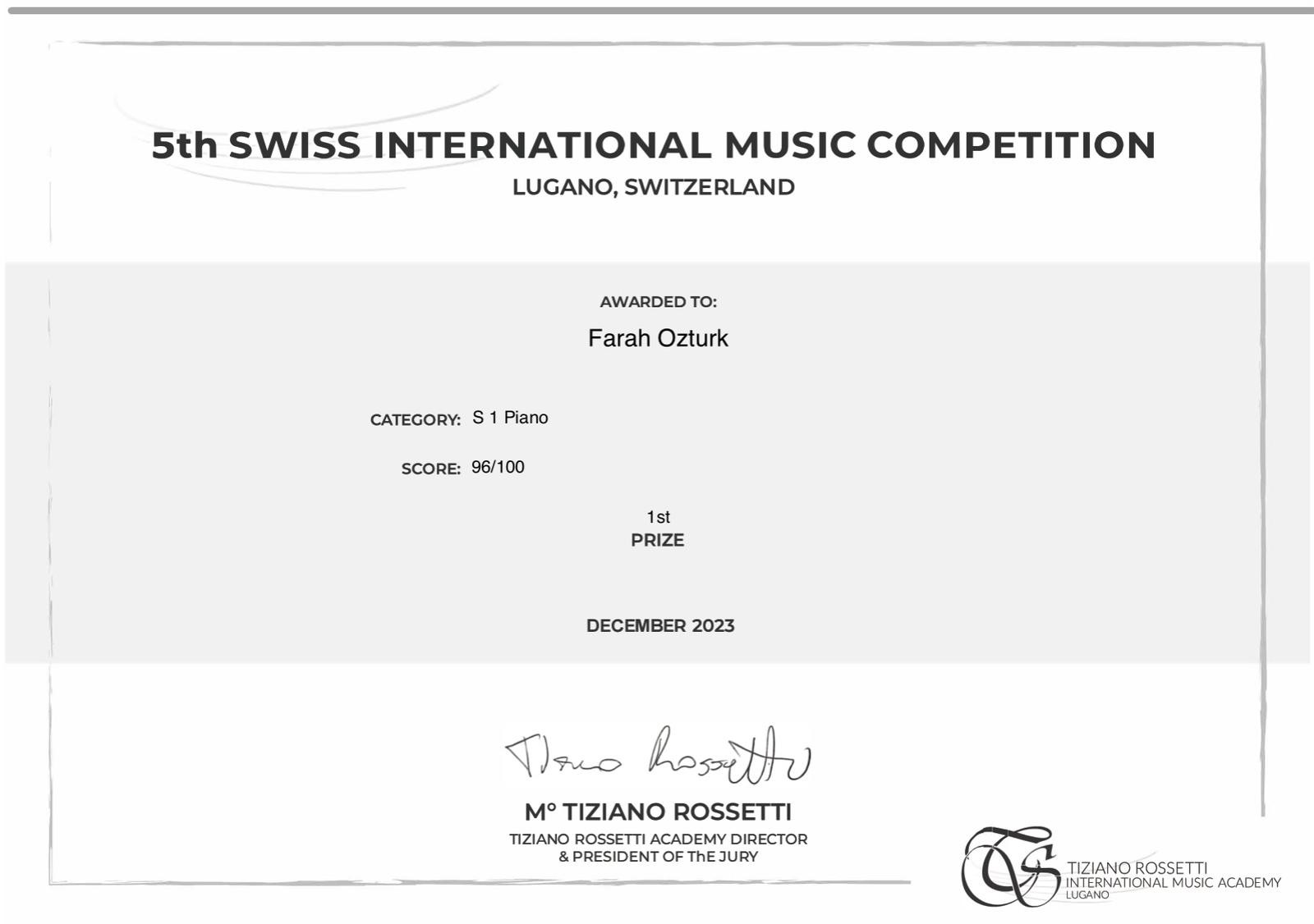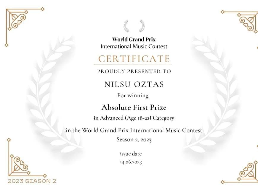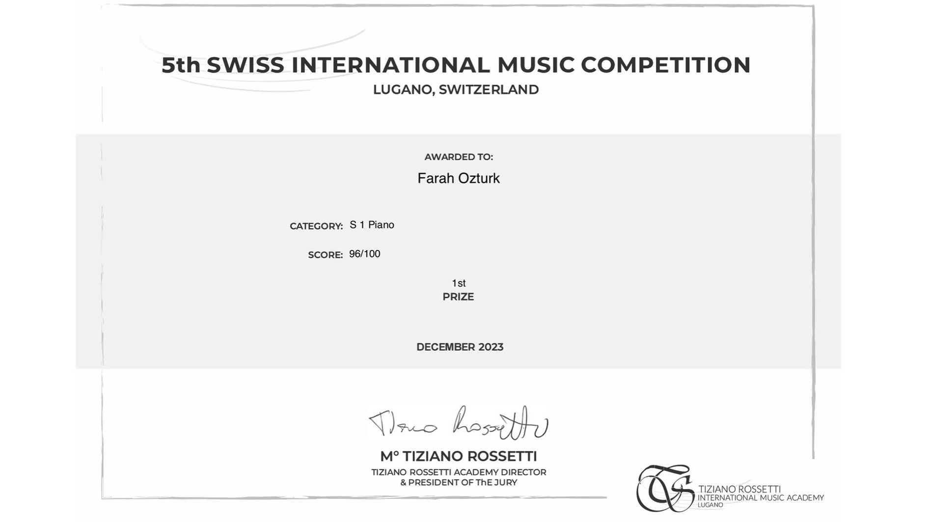 Yarı zamanlı piyano öğrencimiz Farah Öztürk, Polonya merkezli düzenlenen uluslararası Ad Libitum International Piano Yarışması’nda üç ayrı kategoride ödül aldı. Öğrencimiz kendi yaş grubunda (piano prodigy) genel kategoride gümüş madalya, 20. yüzyıl kategorisinde gümüş madalya ve Bach kategorisinde ise bronz madalya aldı. Kısa bir süre sonra aynı öğrencimiz Fransa merkezli yapılan "Deux Mains Et Un piano" yarışmasında da birincilik ödülünün sahibi oldu.
