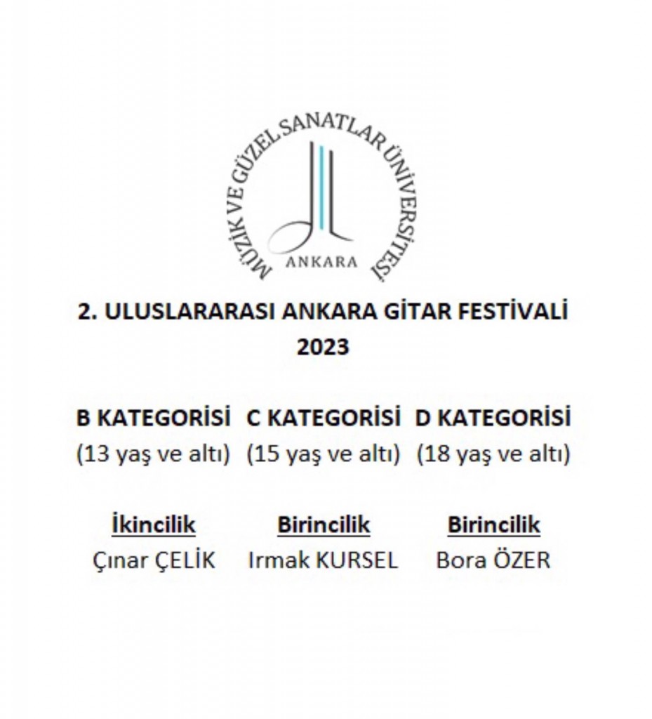 Ankara’da düzenlenen 2. Uluslararası Gitar Festivali’nde farklı kategorilerde Gitar Bölümü öğrencilerimizden Irmak Kursel ve Bora Özer birincilik ödülü alırken Çınar Çelik ise ikincilik ödülüne layık görüldü. Aynı tarihlerde İsviçre’de düzenlenen 5th Swiss International Competition’da okulumuz piyano bölümü öğrencilerinden yarı zamanlı 4. Sınıf öğrencimiz Kerem Rodin Demircan ve tam zamanlı 5. Sınıf öğrencimiz Melisa Göktaş kendi kategorilerinde birinci oldu. Aynı zamanda lise 12. Sınıf öğrencimiz Yeliz Böllü ve lisans 2 öğrencimiz Doğa Ergen de oda müziği kategorisinde birincilik kazandılar. Yine öğrencilerimiz Doğa Ergen ve Yeliz Böllü katılmış oldukları 6. AKOB Ulusal Oda Müziği Yarışması’nda genel oda müziği kategorisinde “Parla Duo” olarak ikincilik ödülü almaya hak kazandılar.