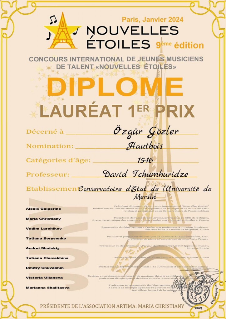 2023 yılında bu başarıların yanı sıra çok önemli burslar alarak yurtdışına davet edilen öğrencilerimiz Konservatuvarımızı gururlandırdı. 2024 yılının ilk başarı haberi ise Obua Bölümü öğrencimiz Özgür Gözler’den geldi. Paris’te düzenlenen Nouvelles Etoiles - music competition genç yetenekli müzisyen yarışmasında birincilik kazanan ve orkestrayla solist olarak çalmak için Paris’e davet edilen Özgür Gözler Konservatuvarımızı, Üniversitemizi ve ülkemizi yurt dışında temsil edecek.