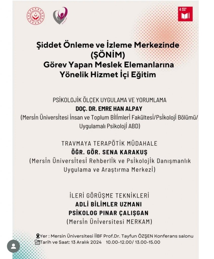 Mersin Üniversitesi Kadın Sorunları Uygulama ve Araştırma Merkezi koordinatörlüğünde düzenlenen Mersin Aile ve Sosyal Hizmetler İl Müdürlüğü'ne bağlı "Şiddet Önleme ve İzleme Merkezinde Görev Yapan Meslek Elemanlarına Yönelik Hizmet İçi Eğitim" etkinliğinde, Rehberlik ve Psikolojik Danışmanlık Uygulama ve Araştırma Merkezi (PDRM) olarak önemli bir destek sağlandı. Etkinlik kapsamında, "Travmaya Terapötik Müdahale" konulu eğitimi Öğr. Gör. Sena Karakuş gerçekleştirdi.