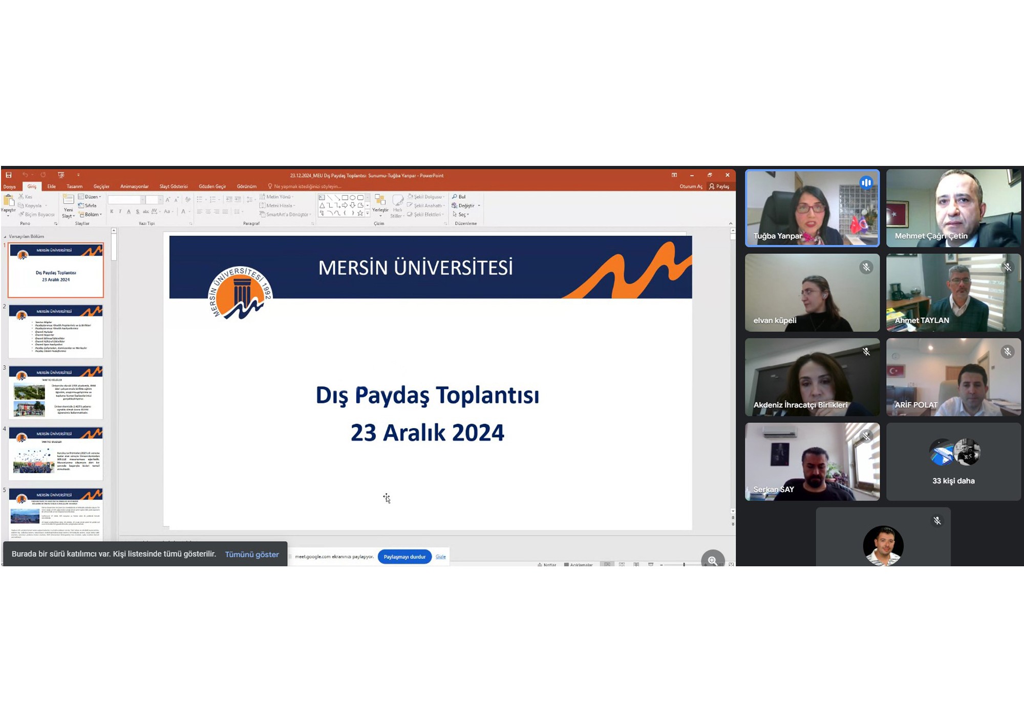 Toplantıda konuşan Rektör Yardımcımız Prof. Dr. Mehmet Çağrı Çetin, kentiyle bütünleşmiş bir üniversite olarak Mersin Üniversitesi’nin çalışmalarını hız kesmeden devam ettirdiğini, bugüne kadar gerçekleştirilen birçok proje ve etkinlik ile üniversitemizin ve şehrimizin gelişimine önemli katkılar sağlandığını belirtti. Üniversite olarak paydaşlarımızla hayata geçirilen projelerin Mersin için olumlu yansımalarının görüldüğünü belirten Prof. Dr. Çetin, önümüzdeki süreçte dış paydaşlarımızla ulusal ve uluslararası iş birliklerini daha da artıracaklarını belirterek tüm paydaşlarımıza Üniversitemize sağladıkları katkılardan dolayı teşekkür etti.