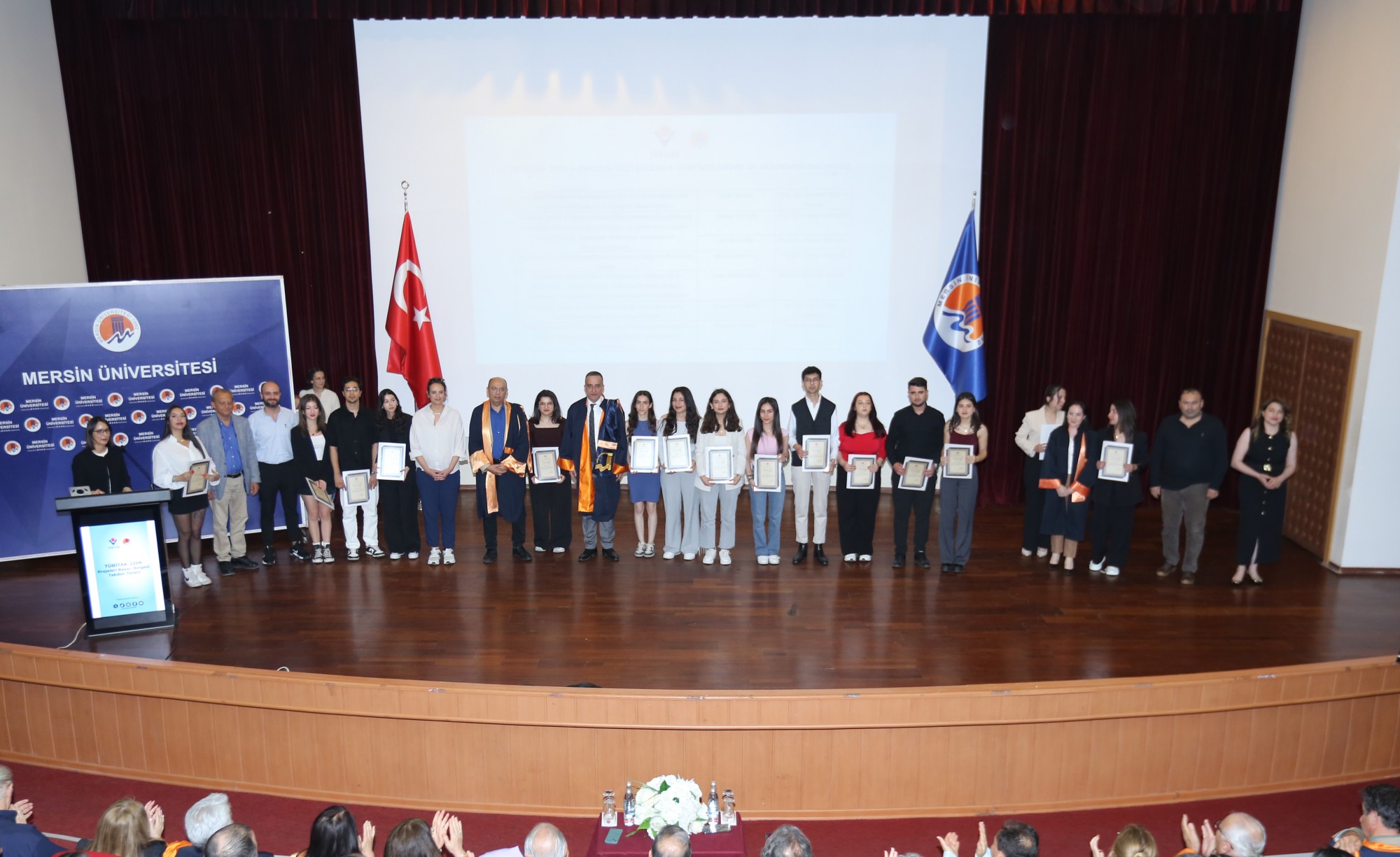 Açış konuşmasının ardından TÜBİTAK 2209-A ve 2209-B programları kapsamında projeleri desteklenmeye hak kazanan öğrencilerimiz ve akademisyenlerimiz tek tek sahneye çağrılarak Rektörümüz, Rektör Yardımcılarımız ve Rektör Danışmanlarımız tarafından başarı belgeleri takdim edildi.