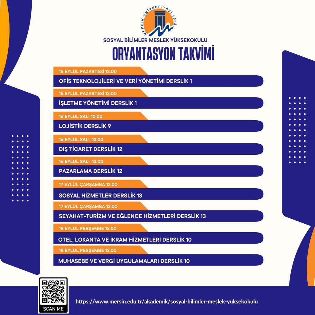 Yeni kayıt olan öğrencilerimize yönelik Oryantasyon Eğitimi, belirtilen gün ve saatlerde ilgili dersliklerde gerçekleştirilecektir. Tüm öğrencilerimizin eğitimlere katılımı önemle rica olunur.