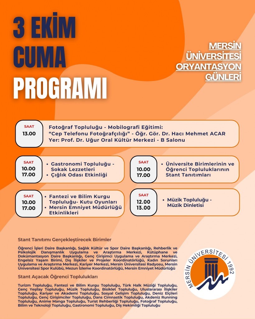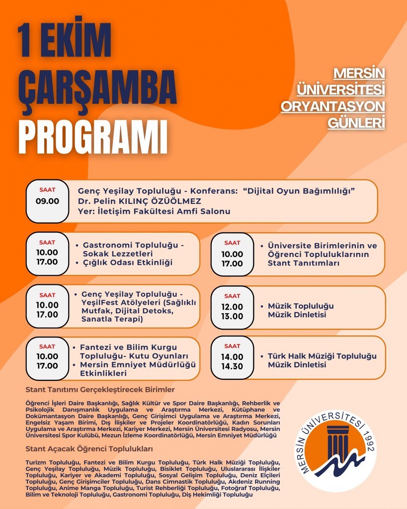 Fakültemize yeni katılan öğrencilerimiz için üniversitemiz tarafından hazırlanan oryantasyon programı 01-03 Ekim 2025 tarihlerinde gerçekleştirilecektir.
