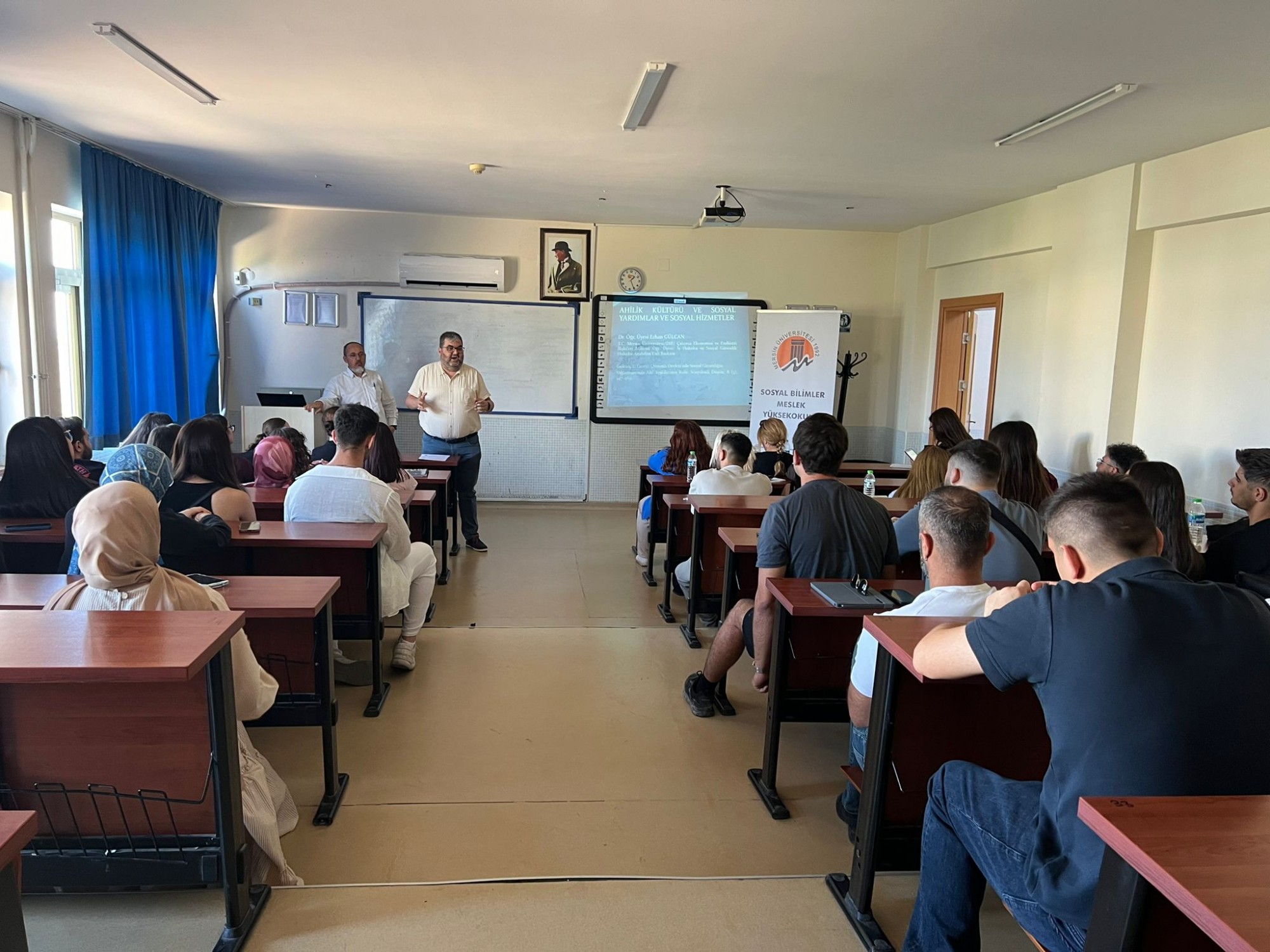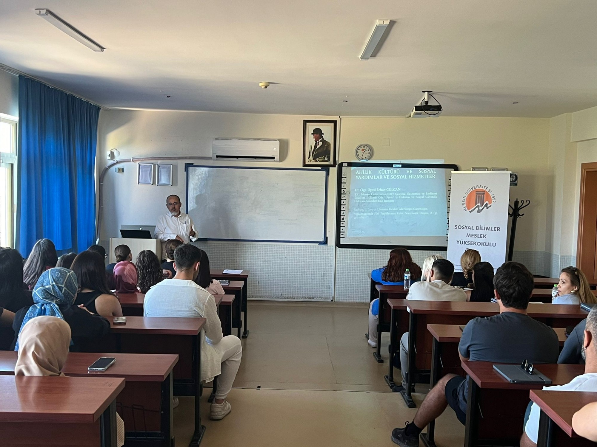 Programın açılış konuşmasını, “Ahiliğin Önemi ve Etik” başlıklı sunumuyla Sosyal Bilimler Meslek Yüksekokulu Müdürü Prof. Dr. İlhan Ege yaptı. Prof. Dr. Ege, konuşmasında ahilik geleneğinin yalnızca esnaf teşkilatı değil, aynı zamanda toplumsal dayanışma, dürüstlük ve mesleki etik ilkelerinin kök saldığı bir yaşam felsefesi olduğunu vurguladı. Ardından, Çalışma Ekonomisi ve Endüstri İlişkileri Bölümü öğretim üyesi Dr. Öğr. Üyesi Erhan Gülcan tarafından “Sosyal Yardımlar ve Sosyal Hizmetler” konulu konferans gerçekleştirildi. Dr. Öğr. Üyesi Gülcan, sosyal yardımların tarihsel gelişiminden ve günümüz sosyal politika uygulamalarıyla olan ilişkilerinden söz ederek, katılımcı öğrencilerin sorularını yanıtladı.