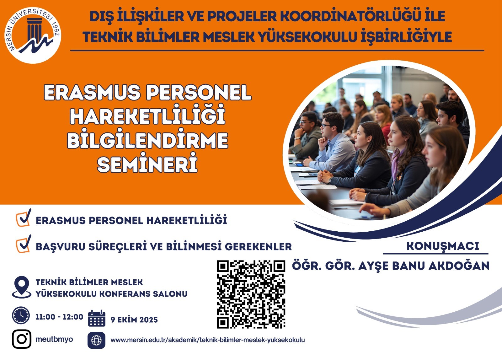 Üniversitemiz Dış İlişkiler ve Projeler Koordinatörlüğü tarafından personelimize yönelik “Erasmus Personel Hareketliliği” konulu eğitim, Öğr. Gör. Ayşe Banu AKDOĞAN tarafından 9 Ekim 2025 Perşembe günü saat 11.00’de Meslek Yüksekokulumuz Toplantı Salonu’nda gerçekleştirilmiştir.