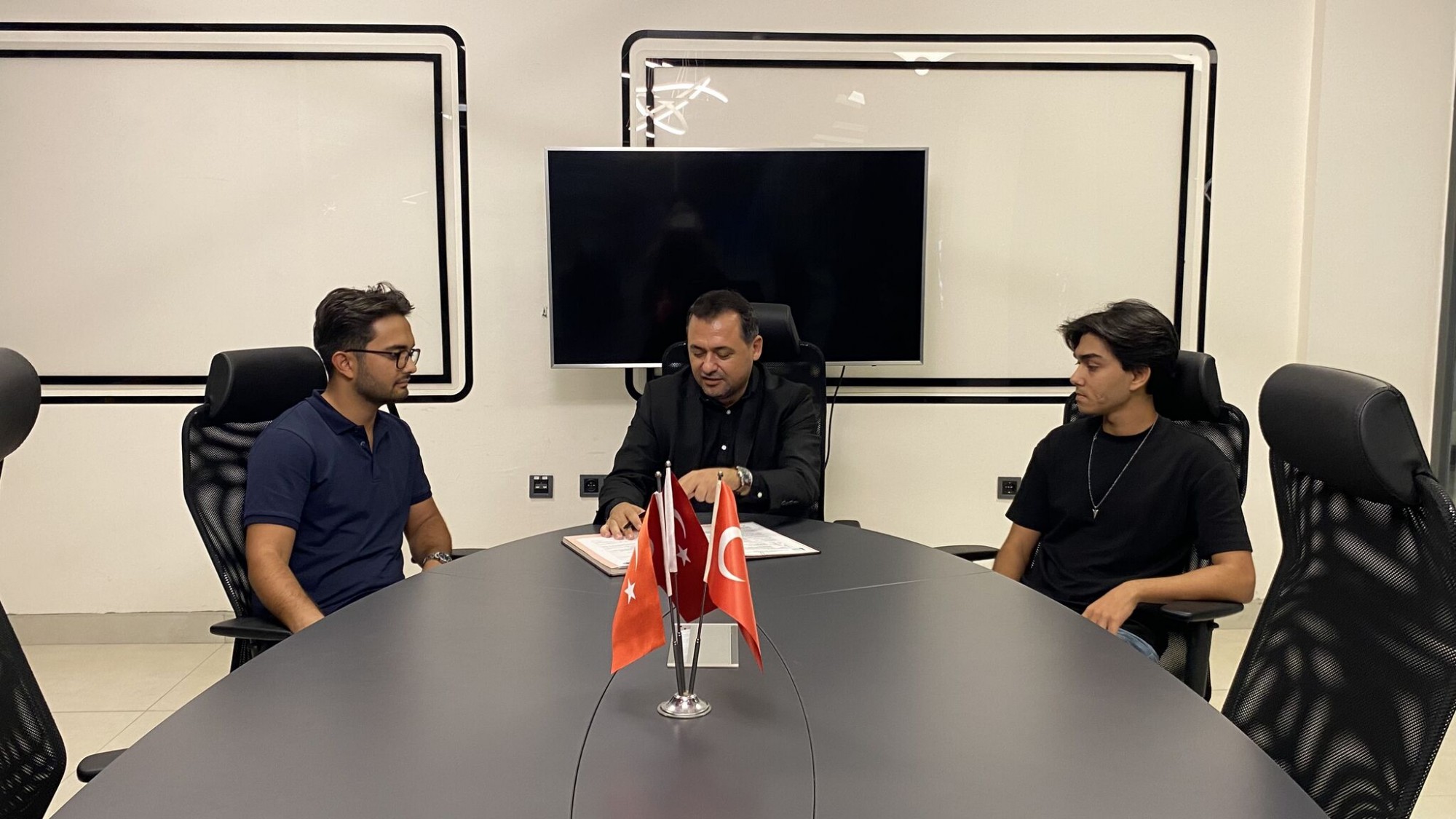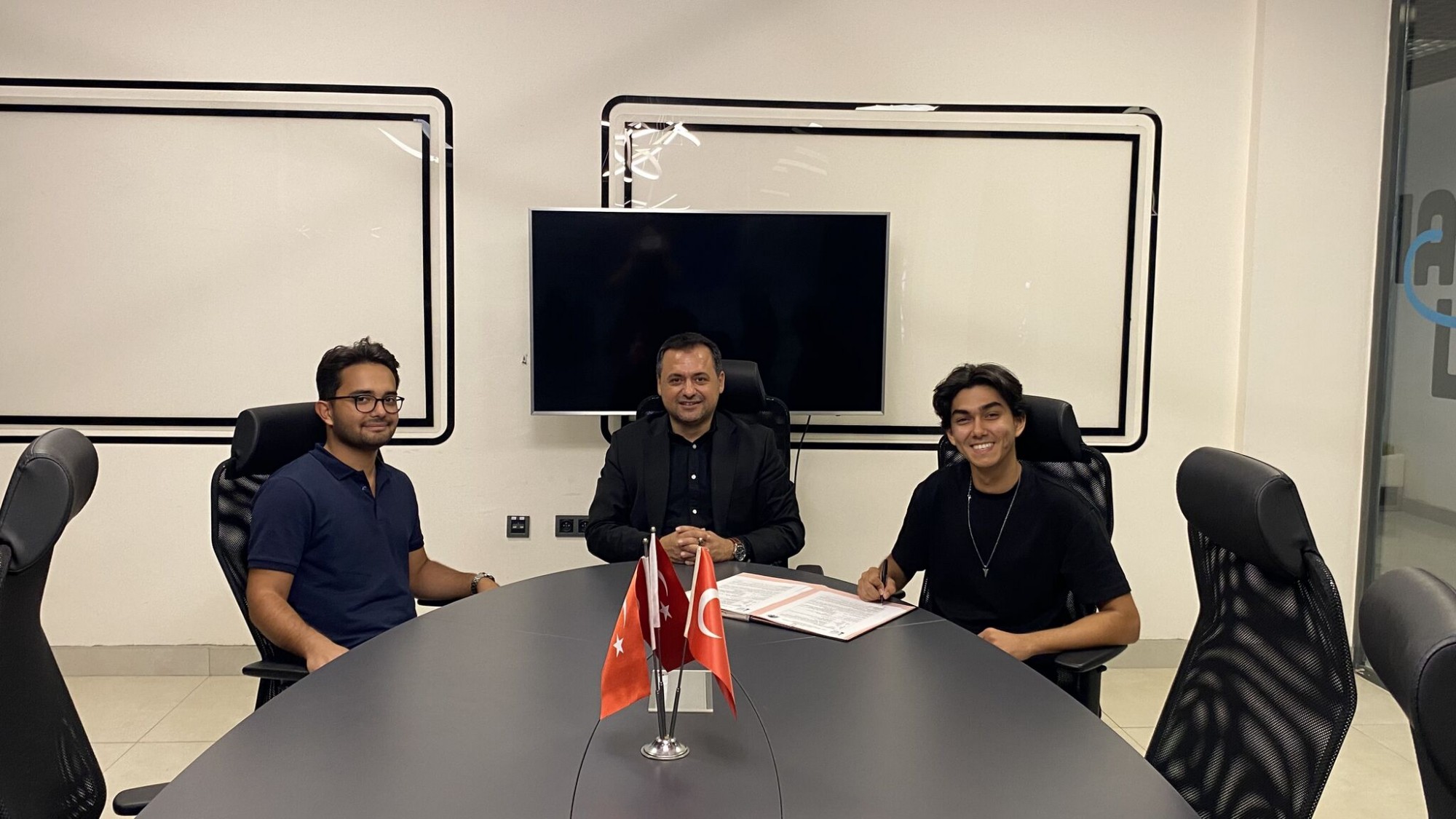 07 Kasım 2025 tarihinde, Mersin Üniversitesi Mühendislik Fakültesi Elektrik-Elektronik Mühendisliği Bölümü öğrencileri olan yeni girişimcilerimiz Talha AŞLAMACI ve Yuşa Berk ABACI, Merkezimizin sunduğu imkânlardan faydalanmak üzere Merkez Müdürümüz Dr. Öğr. Üyesi Gürbüz ÇOMAK ile karşılıklı olarak sözleşme imzalamışlardır.
