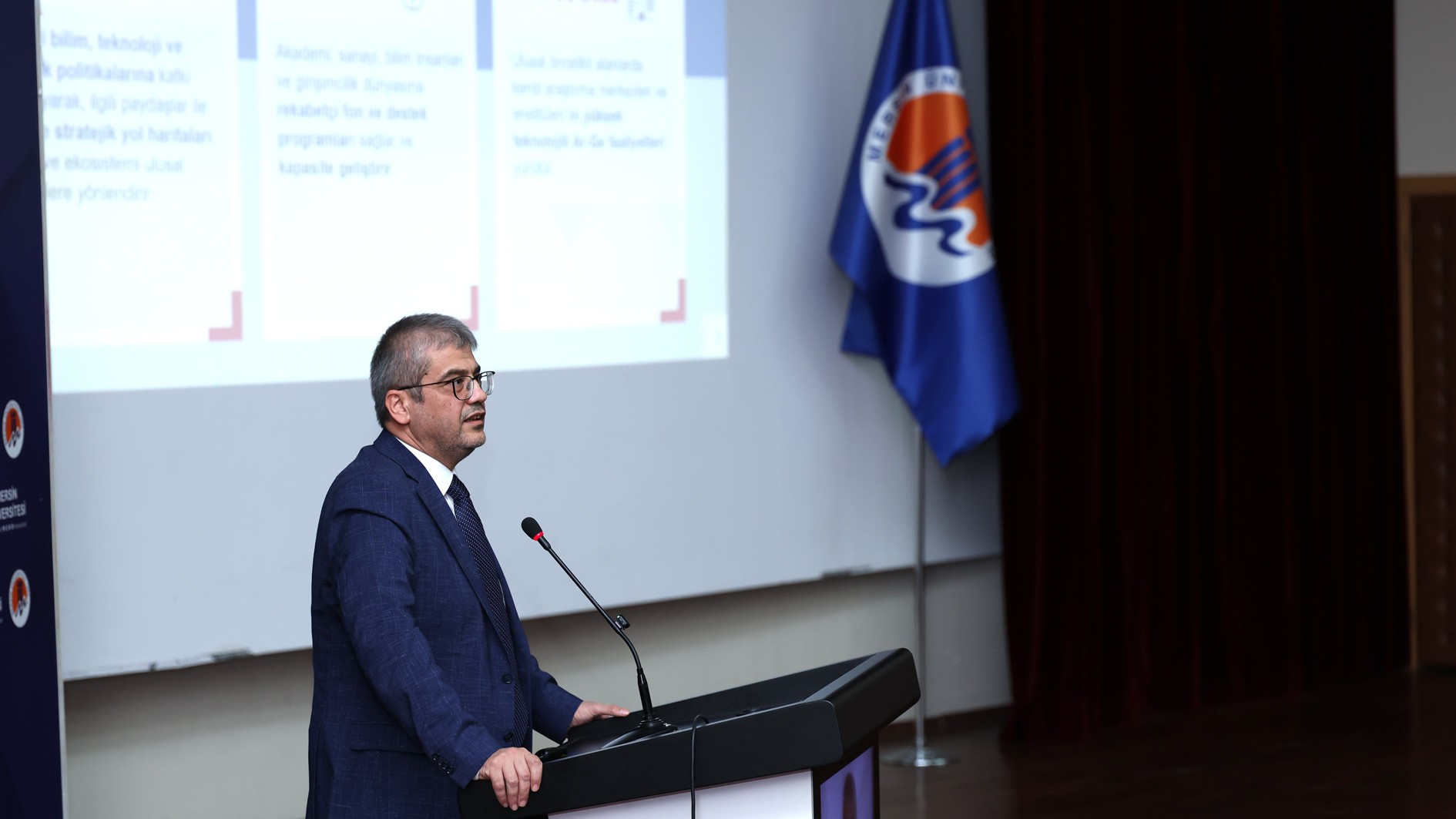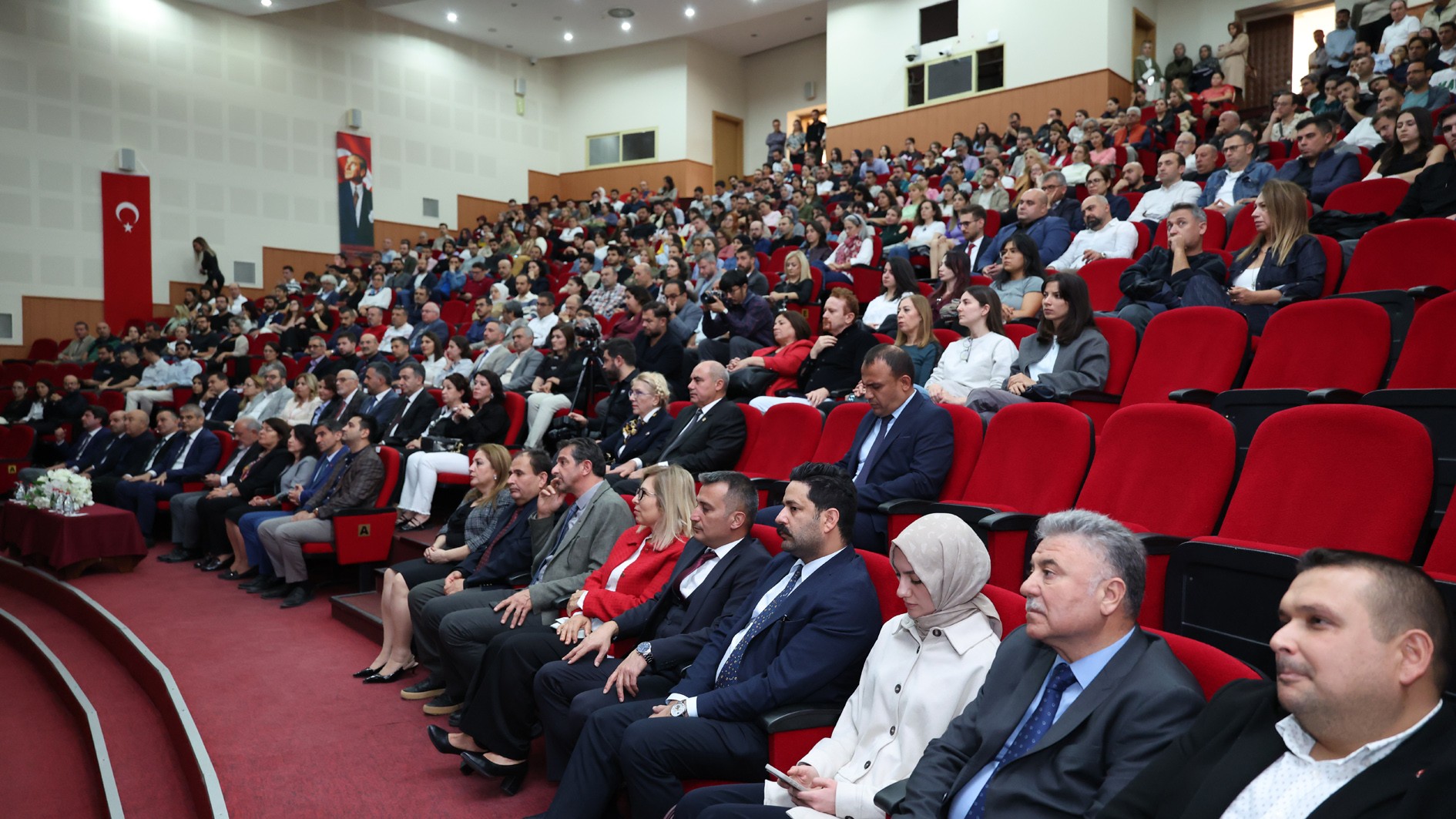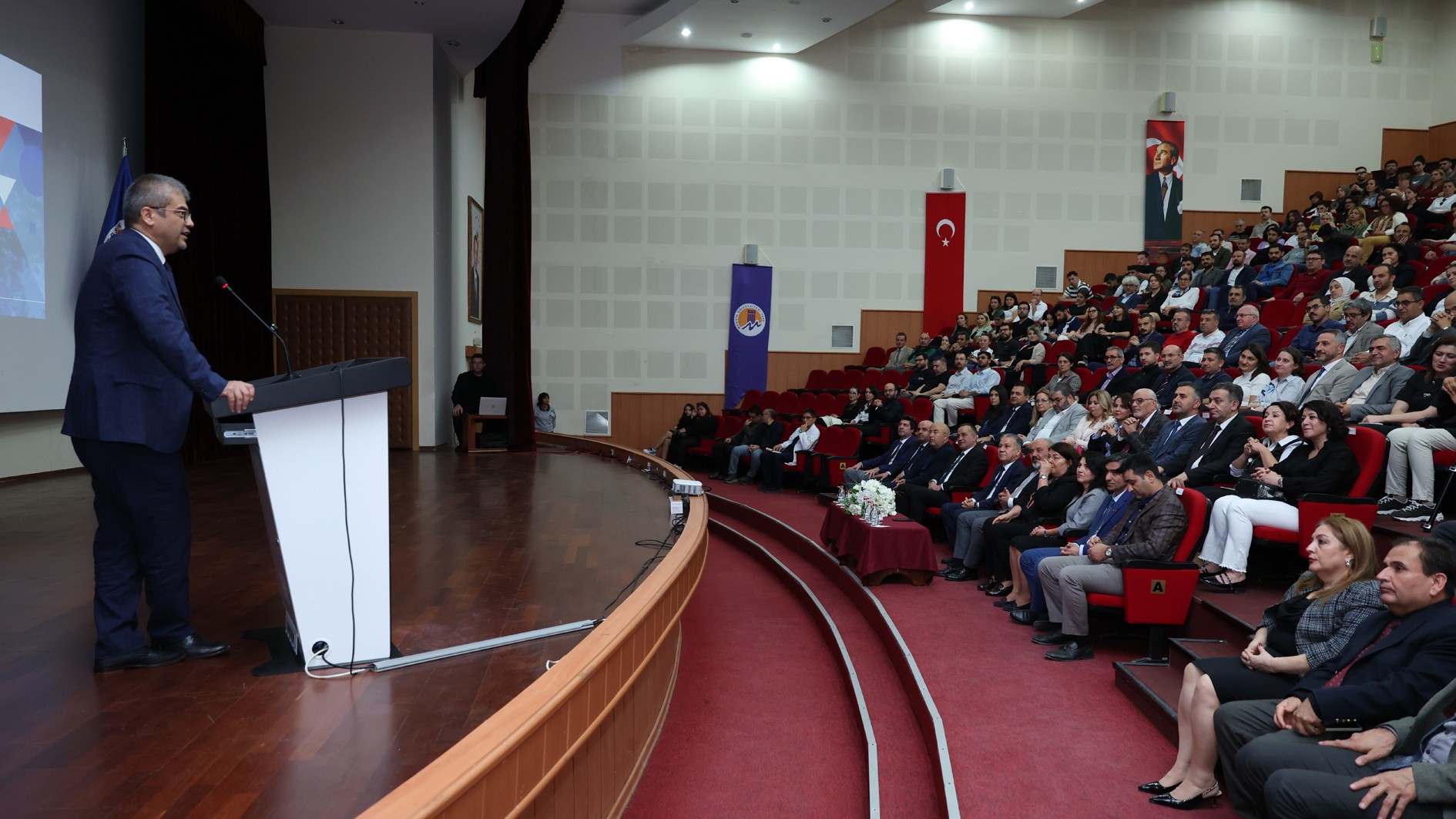Konferans öncesinde selamlama konuşmasını yapan Rektörümüz Prof. Dr. Erol Yaşar, “TÜBİTAK, ülkemizin bilimsel üretim gücünün lokomotifi olarak araştırmacılarımıza güçlü bir rehberlik sunmakta, bilimsel projelerin niteliğini ve etki alanını artıracak önemli destek mekanizmaları geliştirmektedir. Bugün aramızda bulunan değerli Başkanımız Prof. Dr. Orhan Aydın’ın bilgi ve deneyimlerini bizlerle paylaşacak olması bizim için son derece kıymetlidir. Üniversitemiz, araştırma odaklı büyüme stratejileri doğrultusunda tüm birimleriyle bilimsel üretimi artırmayı, genç araştırmacıları desteklemeyi ve ulusal bilim politikalarıyla uyumlu bir gelişim göstermeyi temel hedef olarak benimsemektedir. TÜBİTAK programları bu vizyonun ayrılmaz bir parçası olup akademisyenlerimizin yetkinliğini daha üst seviyeye taşıyacak güçlü fırsatlar sunmaktadır.” ifadelerini kullandı.