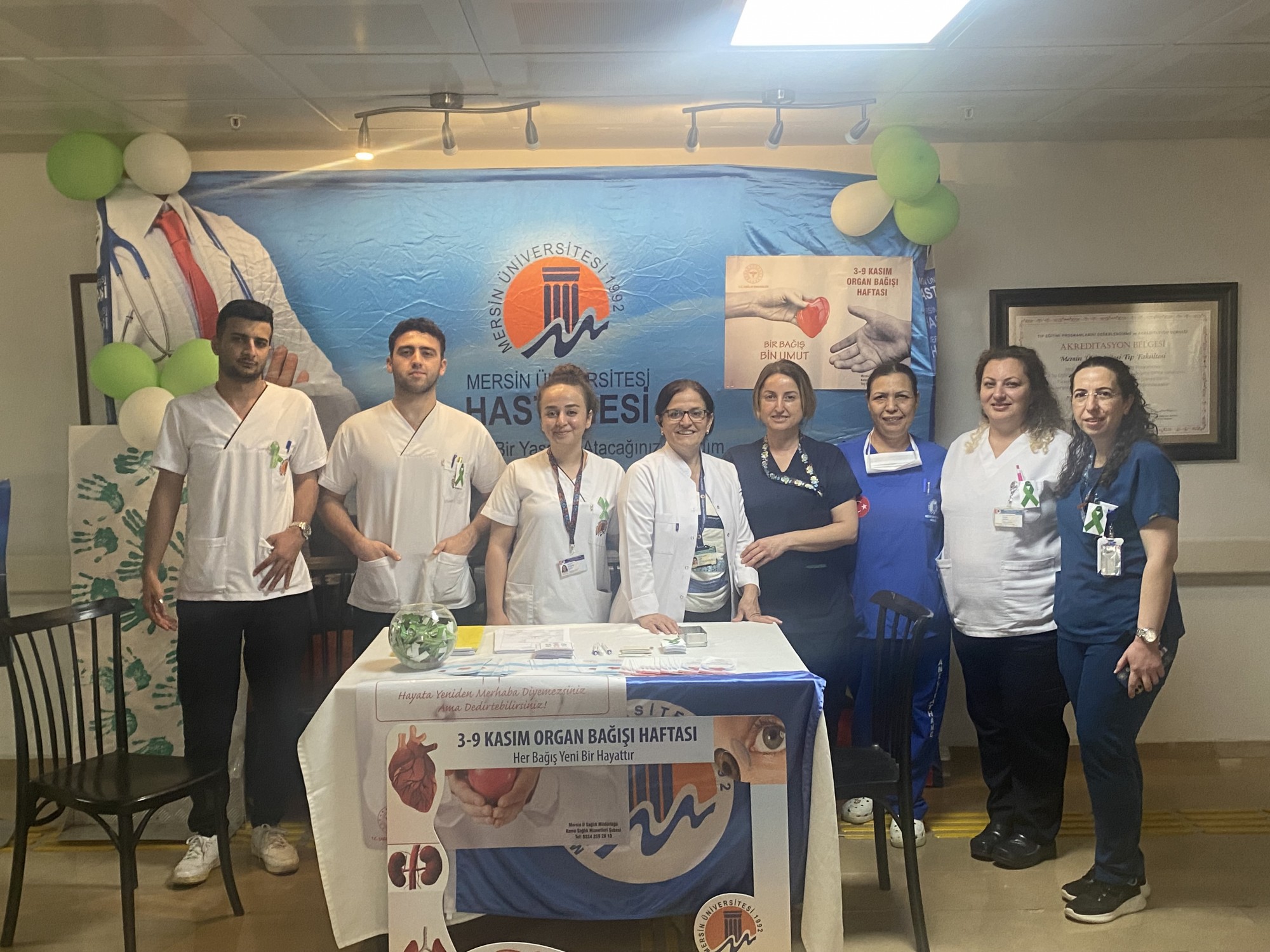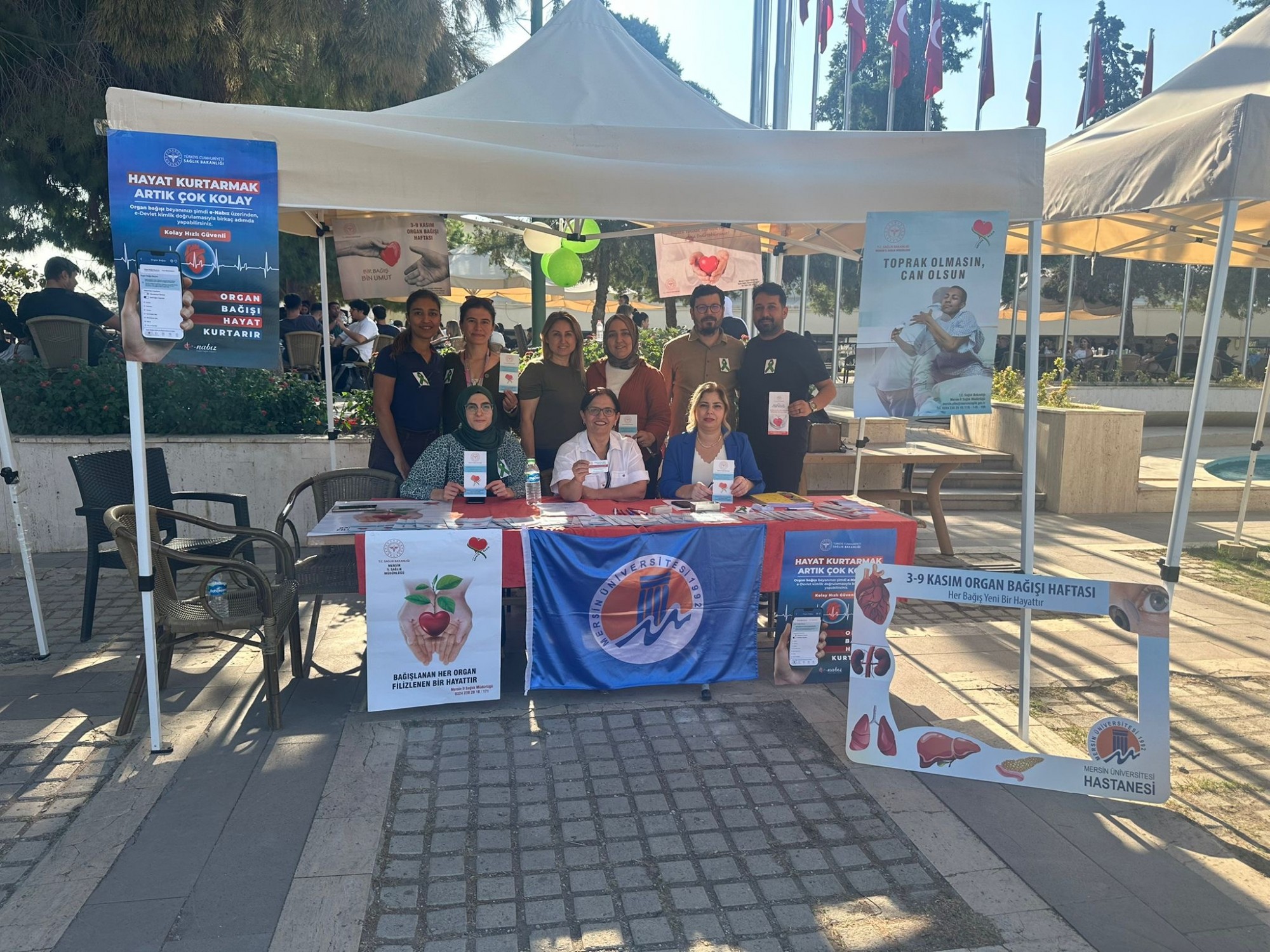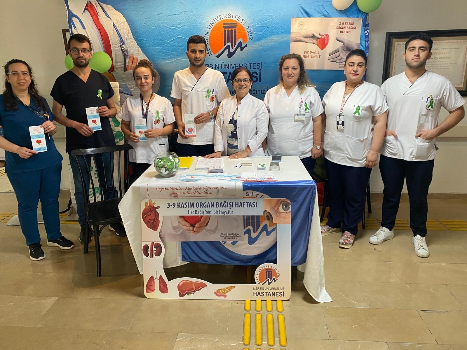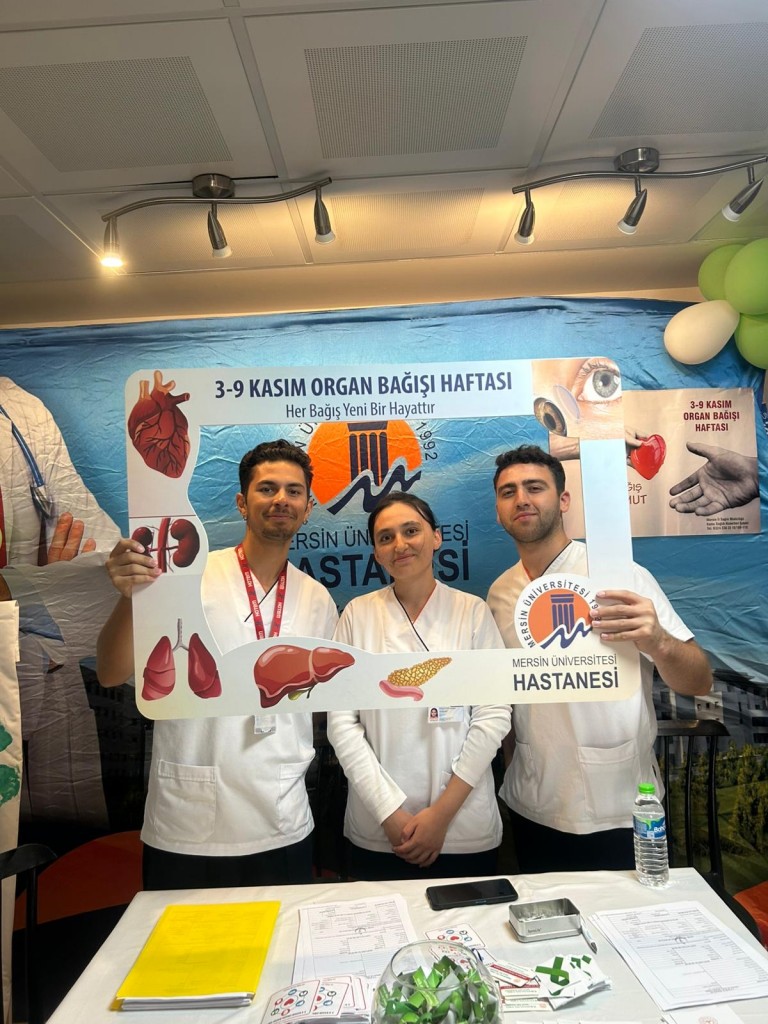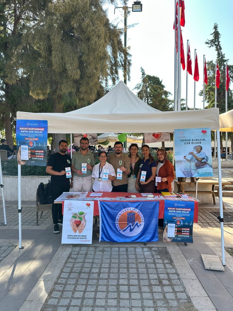 Dünyada ve Türkiye’de istenen düzeyde olmayan kadavradan organ nakli sayısını artırmak amacıyla 3-9 Kasım “Organ Bağışı Haftası’’ olarak kabul edilmekte ve tüm Dünyada çeşitli etkinlikler düzenlenmektedir. Bu kapsamda Mersin Üniversitesi (MEÜ) Sağlık Bilimleri Enstitüsü Hemşirelik Ana Bilim Dalı (ABD), MEÜ Hemşirelik Fakültesi Cerrahi Hastalıklar Hemşireliği ABD ve MEÜ Hastanesi Organ Nakil Merkezi ile birlikte 5 Kasım 2025 tarihinde MEÜ Çiftlikköy Kampüsü meydanında, 6 Kasım 2025 tarihinde ise MEÜ Hastanesi Poliklinik binası danışma alanında organ bağış standı açıldı.  Bu birimlerde görevli öğretim üyeleri ve elemanları ile MEÜ Hastanesi hemşireleri, hemşirelik lisans ve lisansüstü öğrencileri de, ziyaretçiler tarafından organ ve doku nakli/bağışı hakkında sorulan soruları yanıtlayarak etkinliğe destek verdi. MEÜ Hastanesi Organ Nakli Merkezi Koordinatörlerinden Hemşire Zübeyde USANMAZ  ise tanımadıkları insanların yaşamlarına “yaşam umudu” olmak isteyen yeni bağışçıların kaydını yaptı.