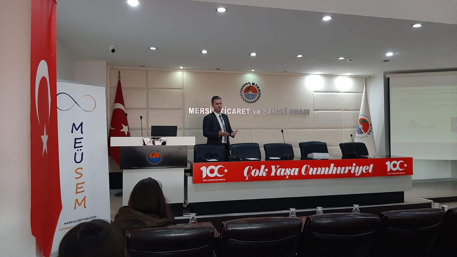 Mersin Üniversitesi Sürekli Eğitim Uygulama ve Araştırma Merkezi işbirliğinde MTSO Eğitim ve Kalkınma Vakfı tarafından düzenlenen “Sertifikalı Dış Ticaret Eğitimi” kapsamında Dr. Onur Gürsoy tarafından 20 Mart 2024 Çarşamba günü “E-İhracat eğitimi” , 21 Mart 2024 Perşembe Günü “E-ticaret Eğitimi “verildi.