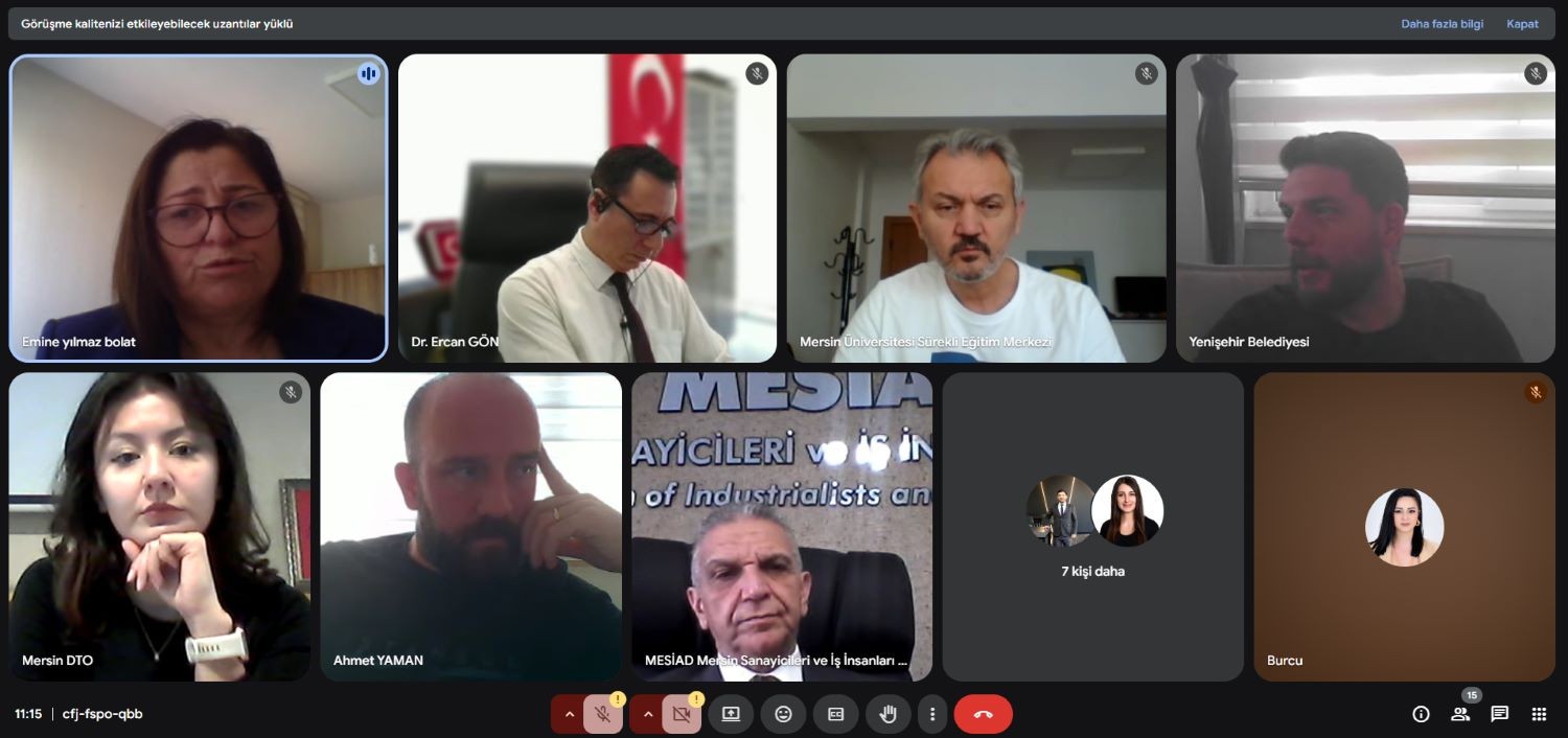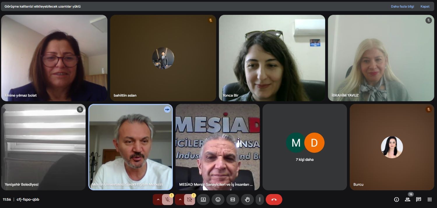 Mersin Üniversitesi Sürekli Eğitim Uygulama ve Araştırma Merkezi dış danışma kurulu toplantısı Merkez Müdürü Prof. Dr. Emine Yılmaz Bolat’ın moderatörlüğünde 21.11.2025 tarihinde saat 11.00 de çevrimiçi olarak gerçekleştirilmiştir. Toplantıda 2025 yılında dış paydaşlarla düzenlenen eğitimler, projeler ve işbirlikleri ile ilgili durum değerlendirmesi yapılırken 2026 yılında gerçekleşmesi planlanan çalışmalar hakkında görüş alışverişinde bulunulmuştur.