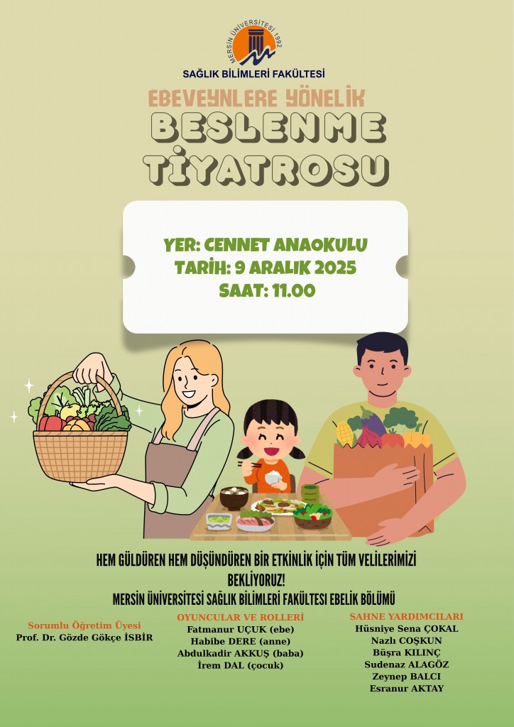 Mersin Üniversitesi Sağlık Bilimleri Fakültesi Ebelik Bölümü öğrencilerimiz, ebeveynlere yönelik “Beslenme Tiyatrosu” ile sağlıklı beslenme farkındalığını eğlenceli bir dille sahneye taşıyor!