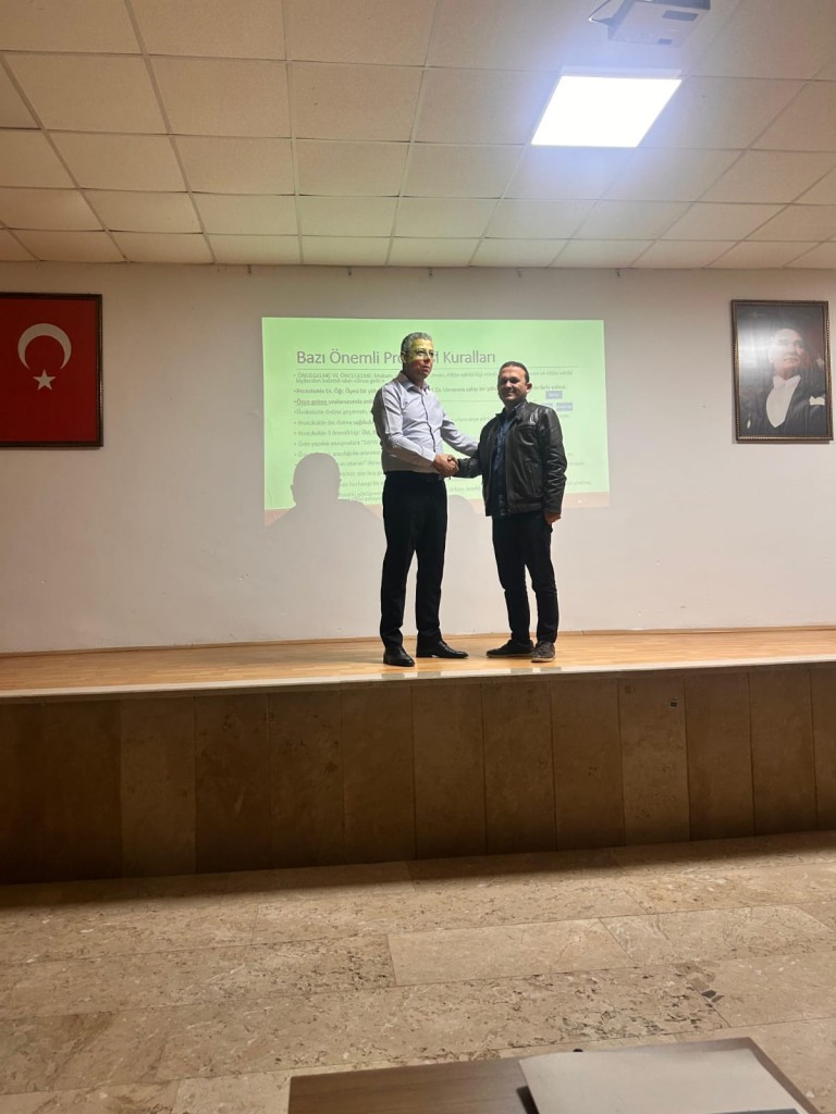 Eğitim, MYO Müdürümüz Doç. Dr. Muhammet Saygın tarafından verildi. Saygın, protokol kurallarının yalnızca resmi tören ve toplantılarla sınırlı olmadığını; kurumsal temsil, iletişim dili, hitap biçimleri ve çalışma ortamındaki davranış standartlarını kapsayan geniş bir çerçeve sunduğunu belirtti. Sunum boyunca katılımcılara; kurum içi ve kurum dışı temsil süreçleri, doğru beden dili kullanımı, nezaket kuralları, makam ve hitap düzeni, toplantı protokolü ve sosyal ortamlarda profesyonel davranış ilkeleri gibi konularda kapsamlı bilgiler aktarıldı.