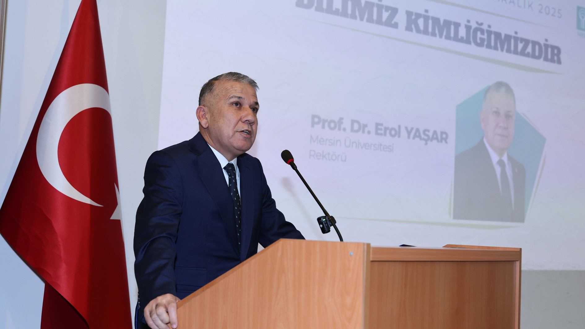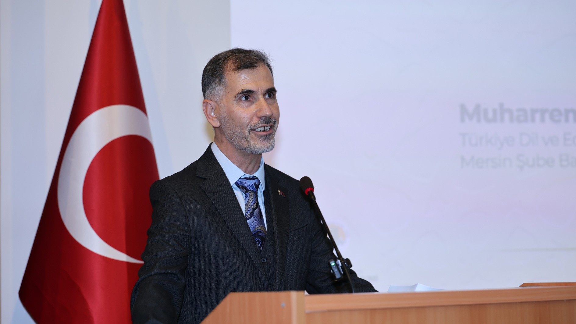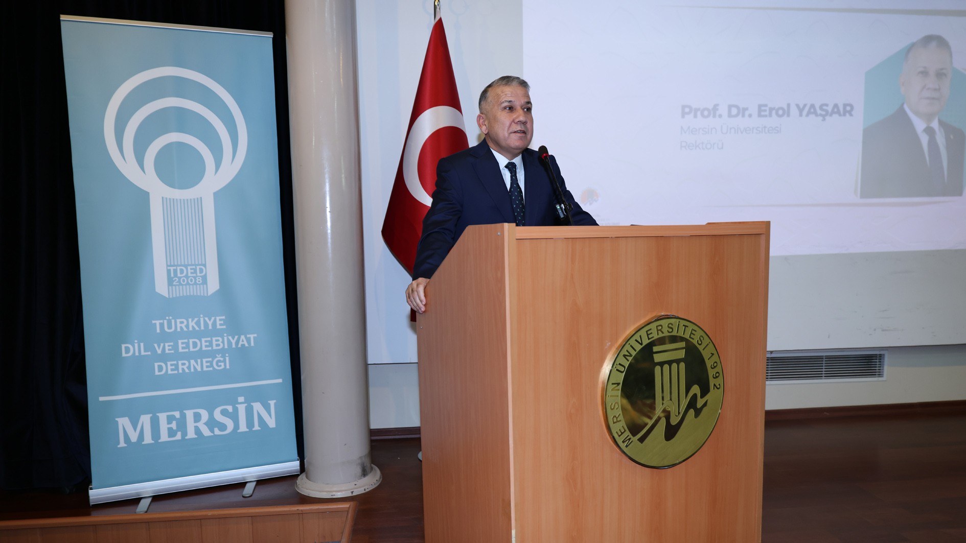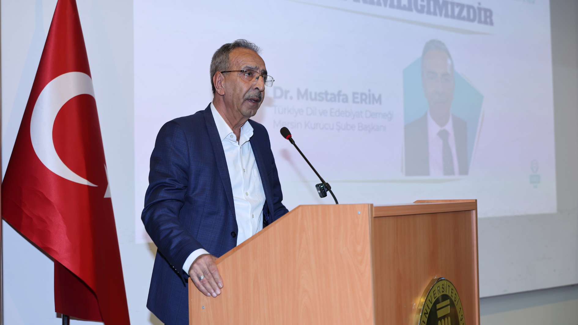 Türkiye Dil ve Edebiyat Derneği Mersin Şubesi Kurucu Başkanı Dr. Mustafa Erim, selamlama konuşmasına derneğin amacının toplumda dil bilincinin yerleşmesi ve dilin doğru kullanılması, edebiyatımızın gelişmesi ve zenginleşmesini sağlayacak çalışmaları yaygınlaştırmak olduğunu ifade ederek başladı. Dr. Erim konuşmasında; dilimize karşı kayıtsızlığın ve özenti eğilimlerinin tehlikeli boyutlara ulaştığını, üretilen mal ve ürün isimlerinde, ticari unvanlarda ve işletme adlarında yabancılaşmanın arttığını belirtti. Cadde ve meydanlarda mağaza ve işletme isimlerinde görülen dil kirliliğine dikkat çeken Erim, “Tarihi adım adım geriye doğru takip ettiğimizde ‘kadim medeniyet’ kavramının hakkını veren bu coğrafya ve bu coğrafyadan yayılan ışığın tesirine kanat çırpan binlerce mütefekkir, ilim-irfan sahibi, şair ve yazar; asırlardır yürüdüğümüz yolların sonsuz aydınlatıcıları olmuştur. Düşünen bilir, bilen söyler, söyleyen yazar. Dil; düşünenin, bilenin ve söyleyenin kalemidir.” ifadelerini kullandı. Dr. Erim, konferansın düzenlenmesinde emeği geçen herkese teşekkür etti.